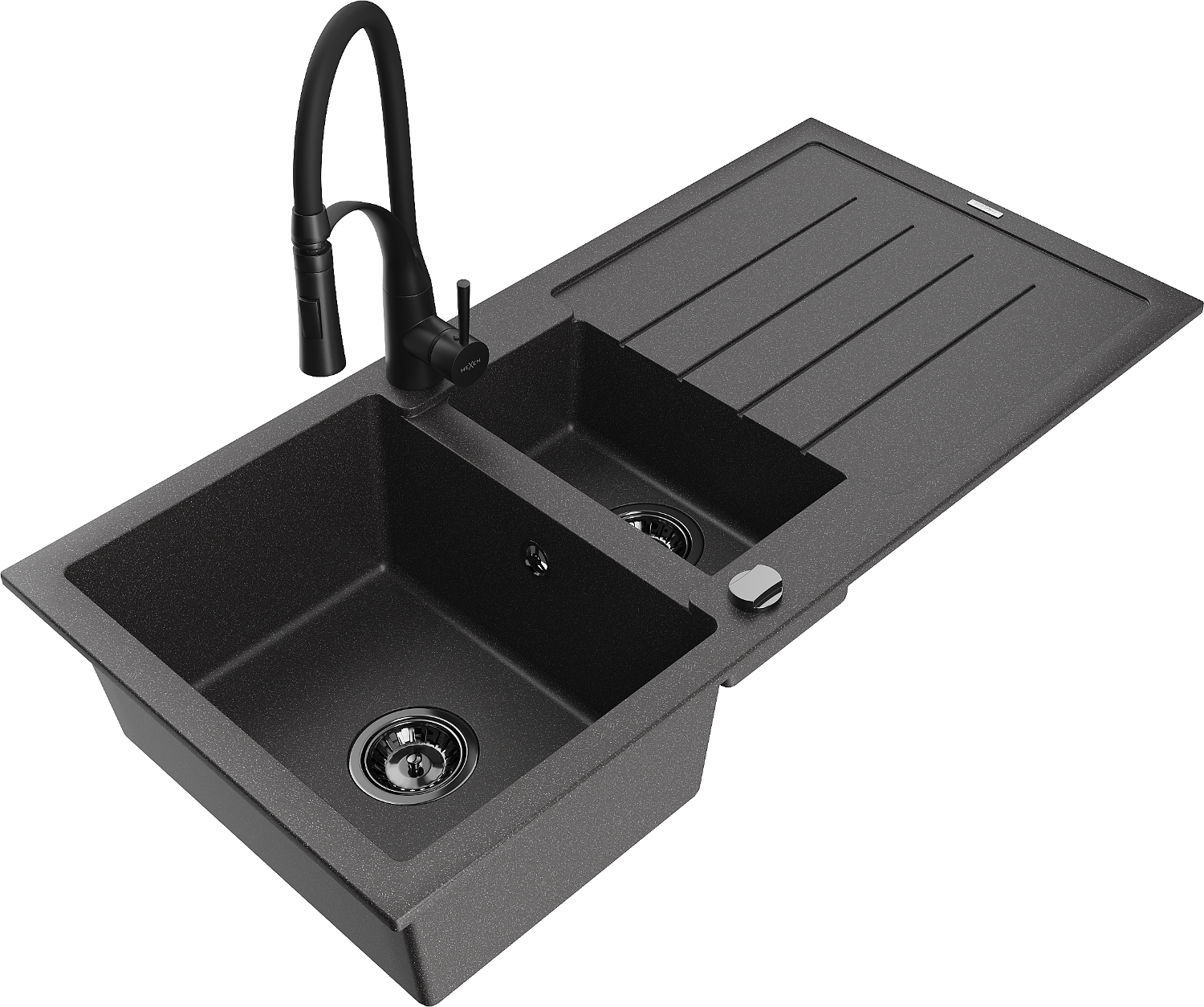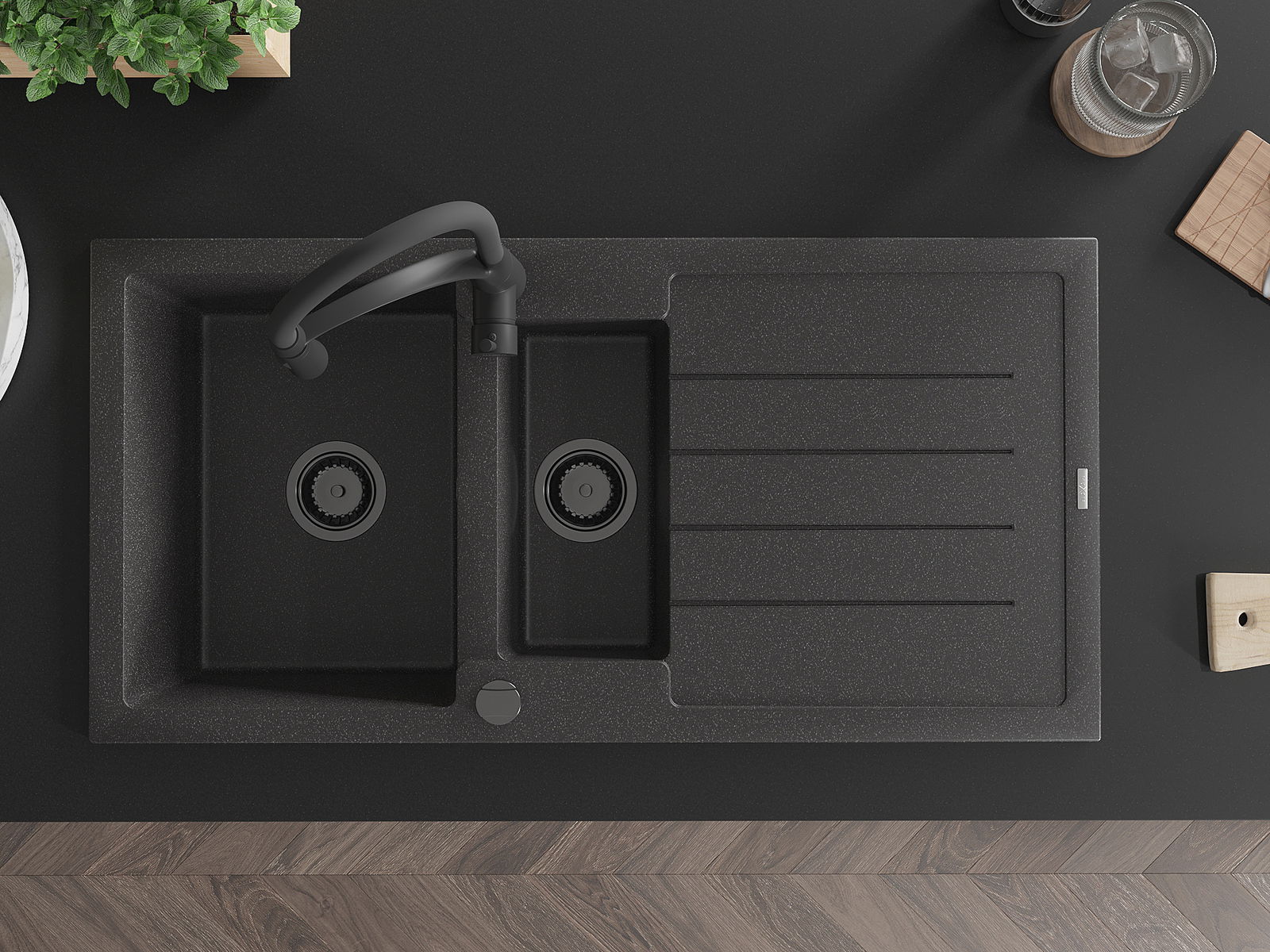 Mexen Andres chiuvetă din granit cu 1,5 compartimente, cu scurgător și baterie de bucătărie Aster, negru cu pete