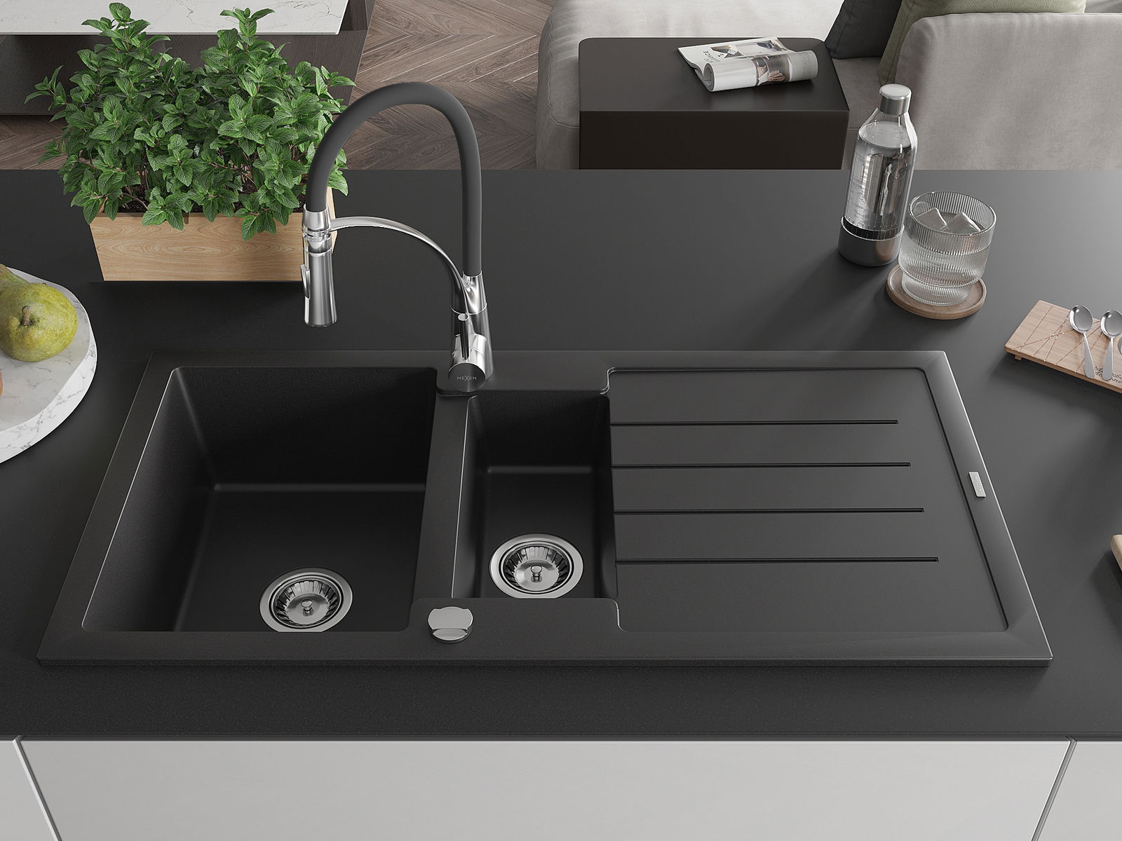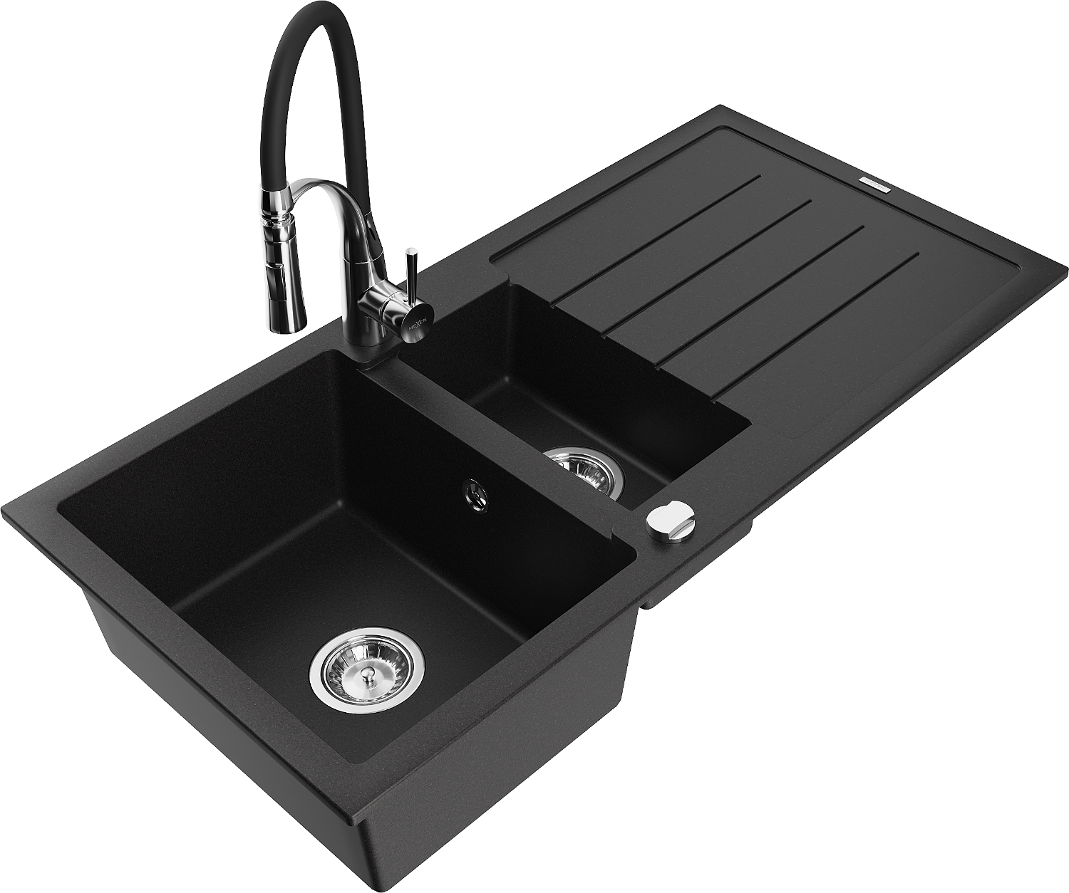 Mexen Andres chiuvetă de granit 1,5 compartimente cu scurgător și baterie de bucătărie Aster, negru - 6515-77-73450-07