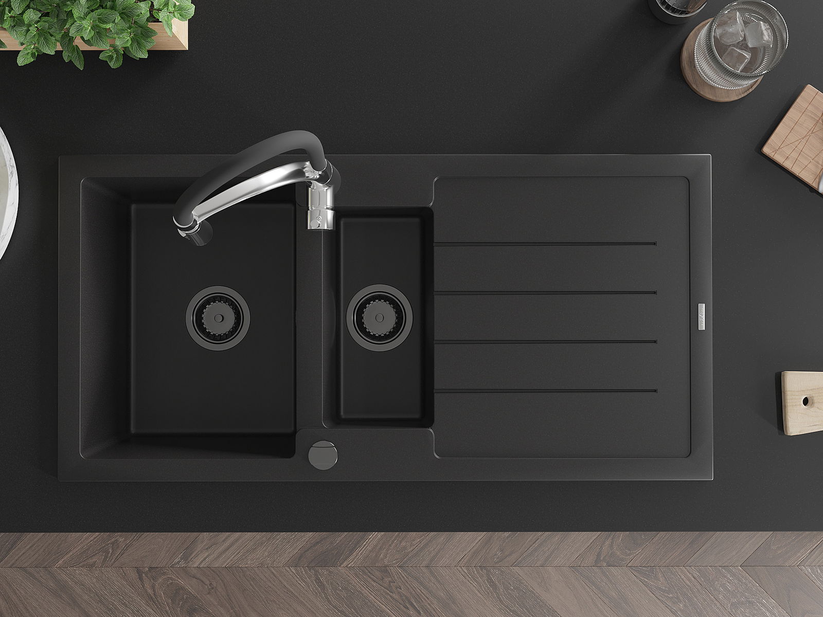 Datorită sistemului de montare universală, chiuveta este reversibilă, iar scurgerea poate fi montată pe blat la stânga sau la dreapta. În acest fel, puteți ajusta cu ușurință pagina la nevoile și condițiile dvs.