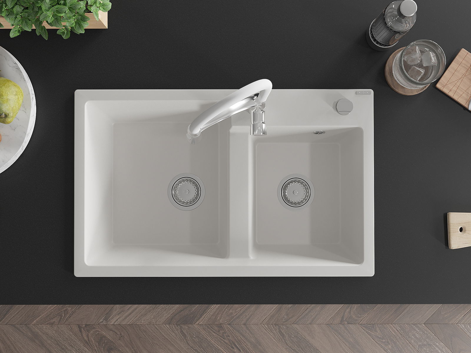 Mexen Tomas chiuvetă de bucătărie din granit cu 2 compartimente și baterie de bucătărie Aster, alb - 6516-20-73450-02