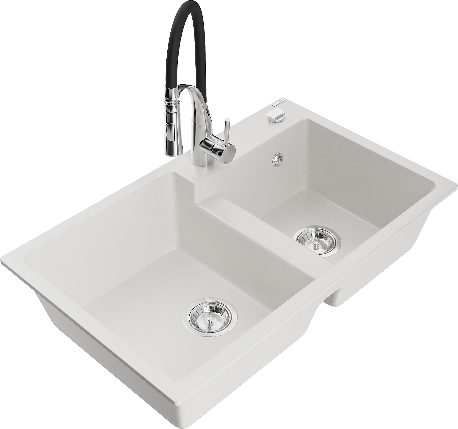 Mexen Tomas chiuvetă de granit cu 2 compartimente cu baterie de bucătărie Aster, alb - 6516-20-73450-07