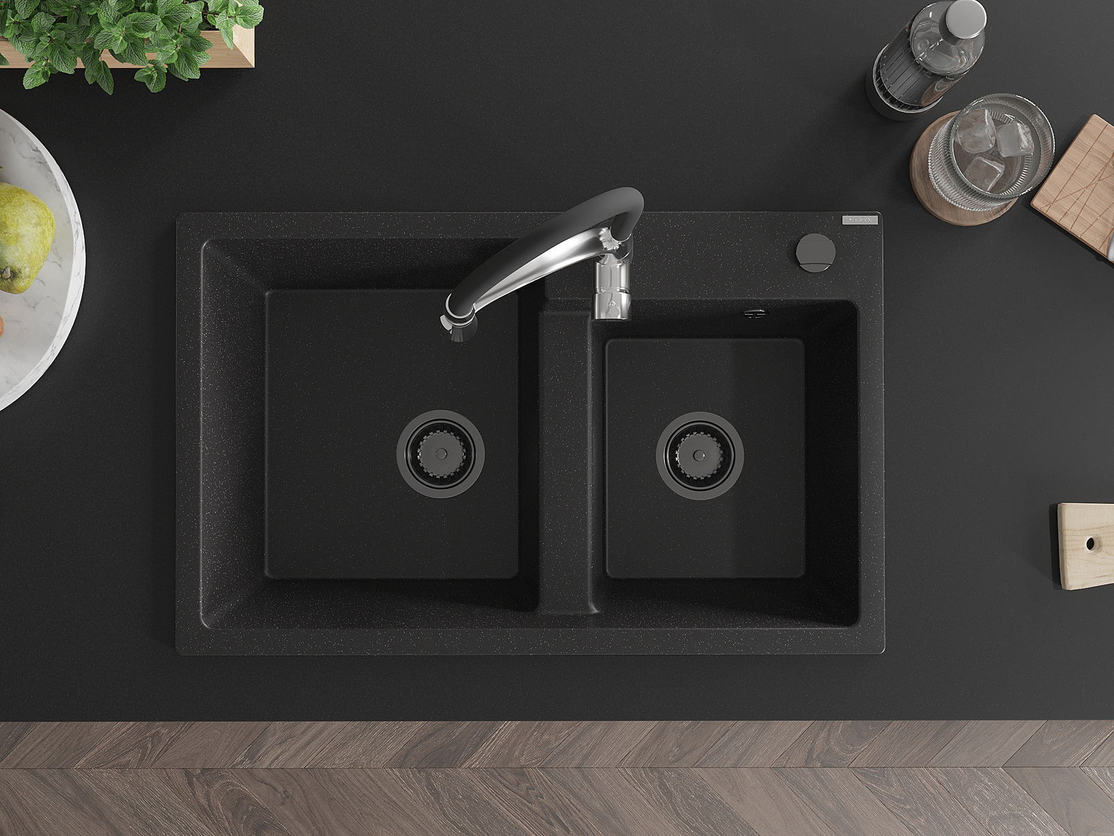 Mexen Tomas chiuvetă de bucătărie din granit cu 2 compartimente și robinet de bucătărie Aster, negru/argintiu metalizat