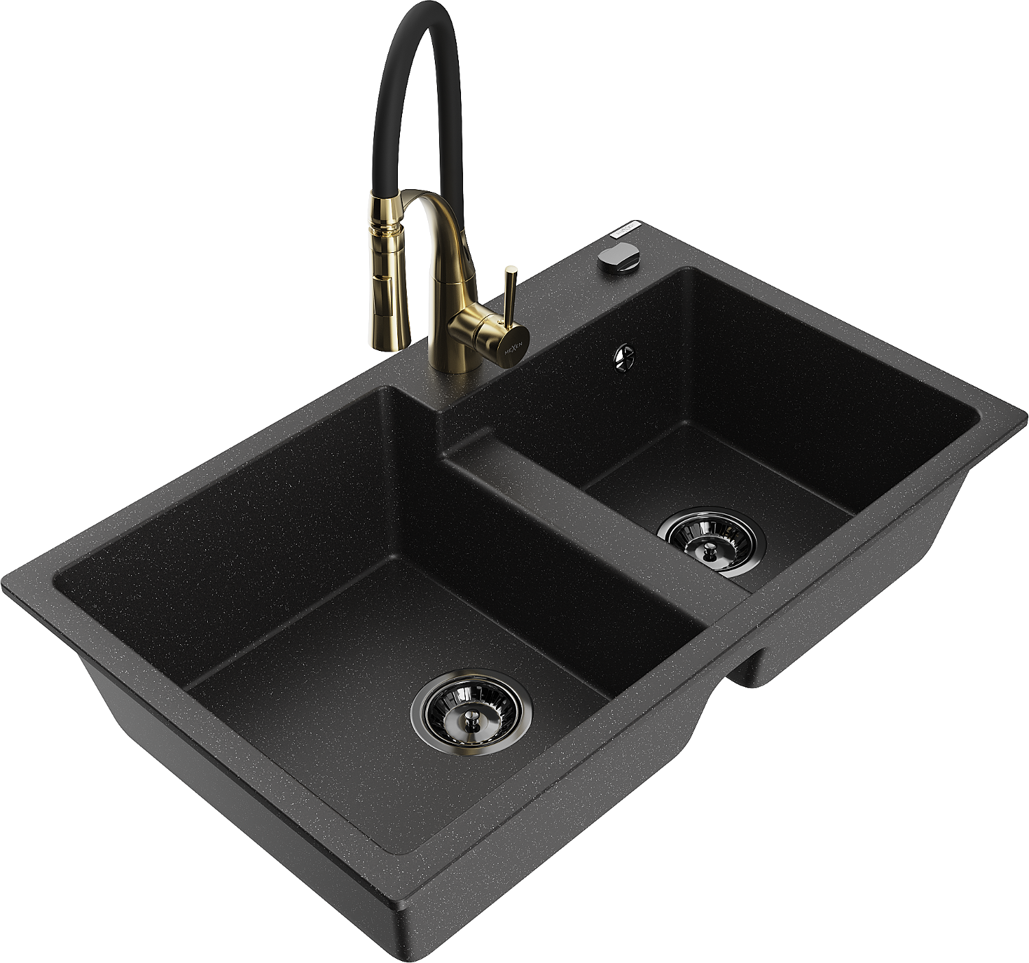 Mexen Tomas chiuvetă de bucătărie din granit cu 2 cuve și baterie Aster, negru/metal argintiu - 6516-73-73450-57-B