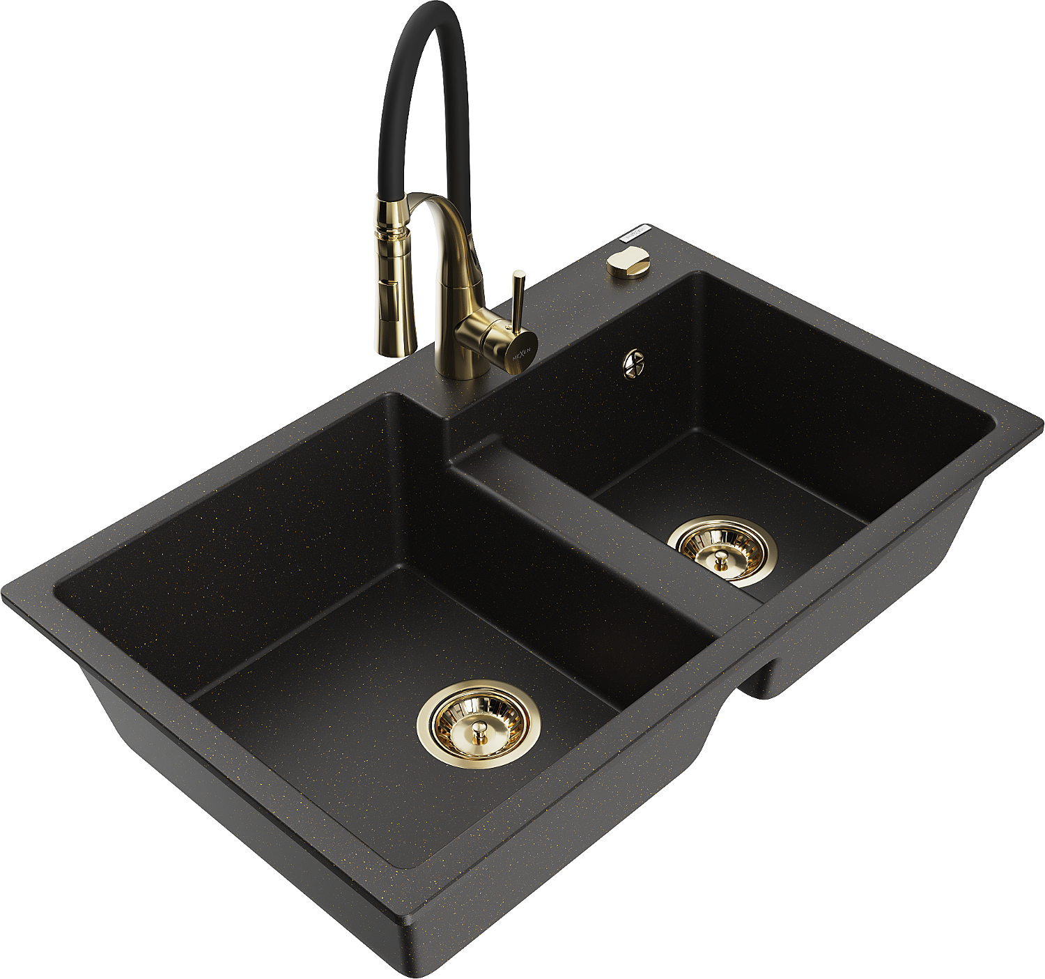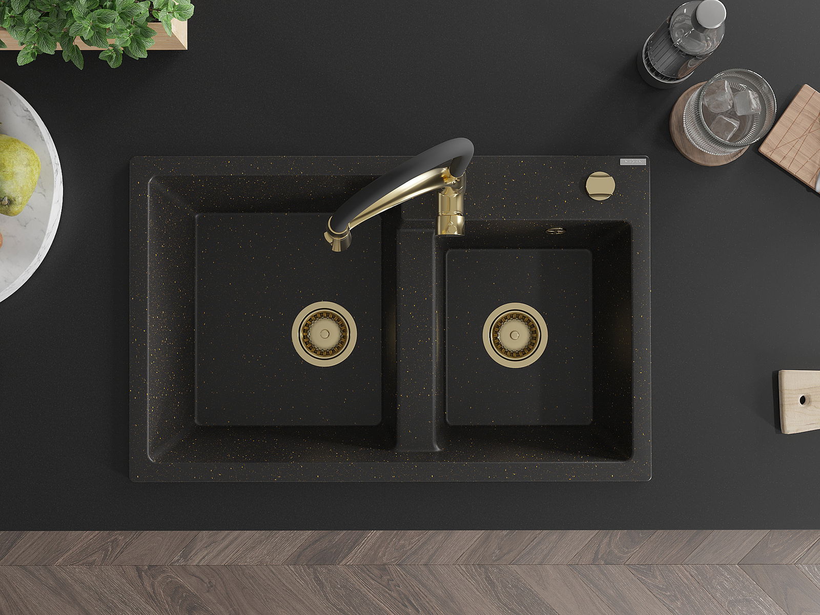Mexen Tomas chiuvetă de granit cu 2 compartimente și baterie de bucătărie Aster, negru/auriu metalic - 6516-75-73450-57-G