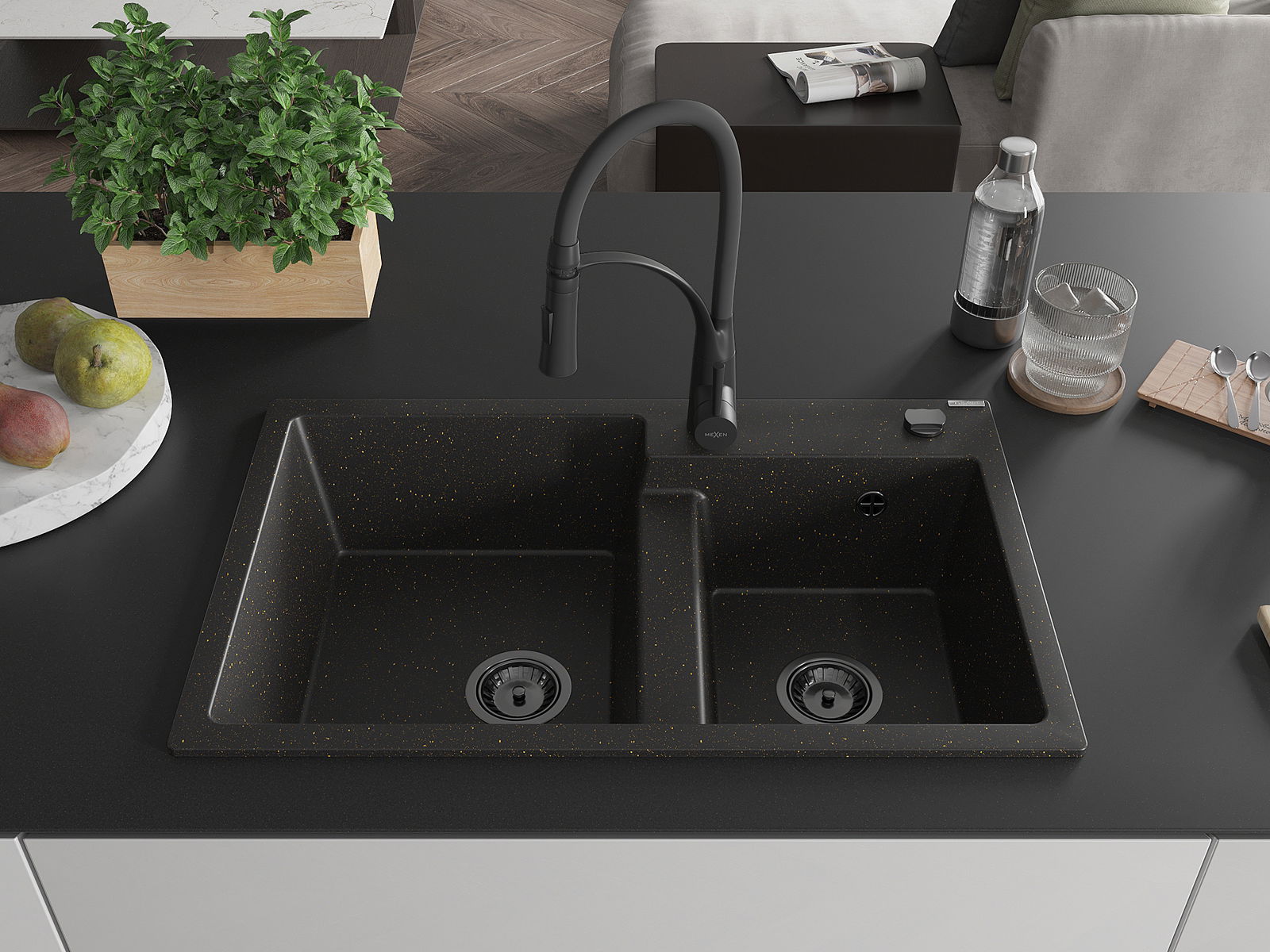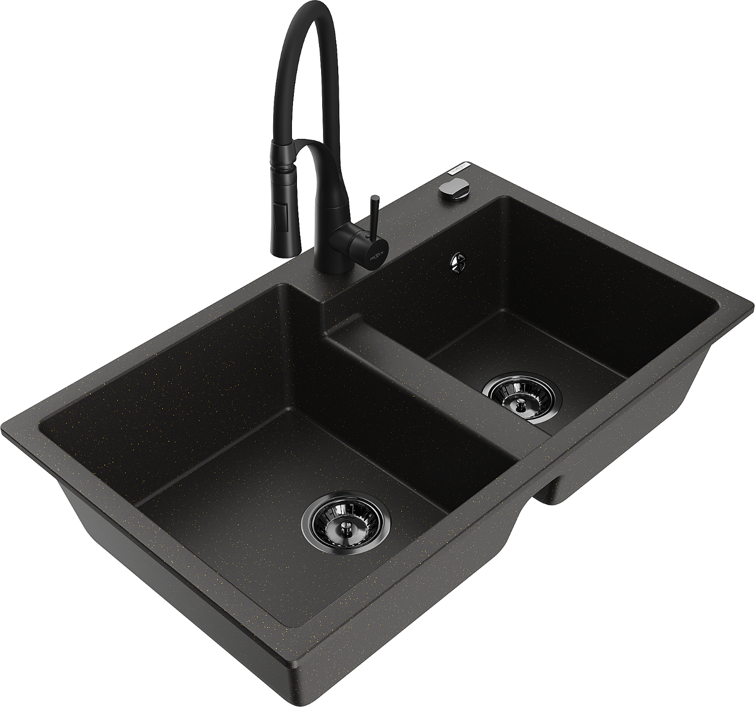 Mexen Tomas chiuvetă de bucătărie din granit cu 2 compartimente și baterie Aster, negru/auriu metalizat - 6516-75-73450-70-B