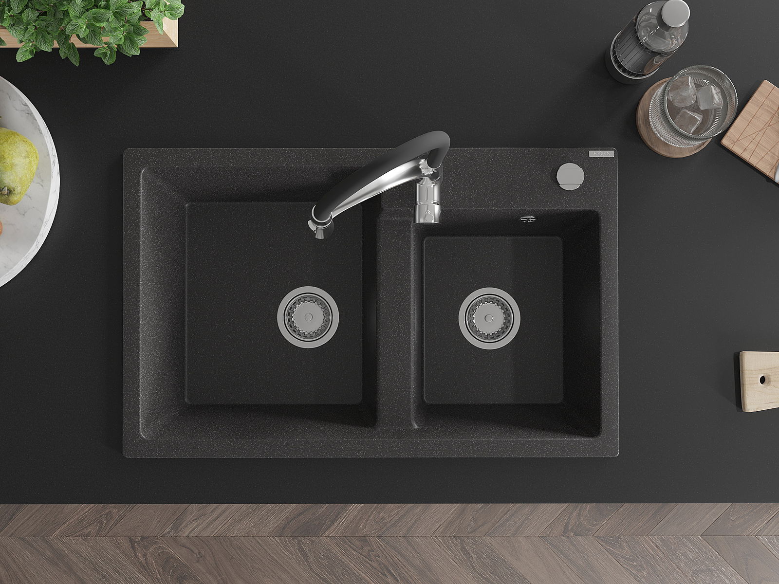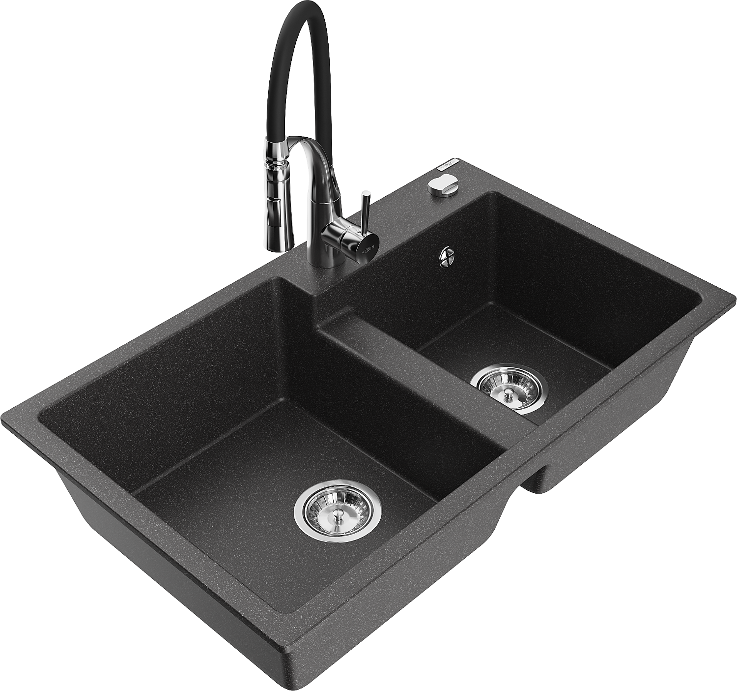 Mexen Tomas chiuvetă de granit cu 2 compartimente și baterie de bucătărie Aster, negru pătat - 6516-76-73450-07