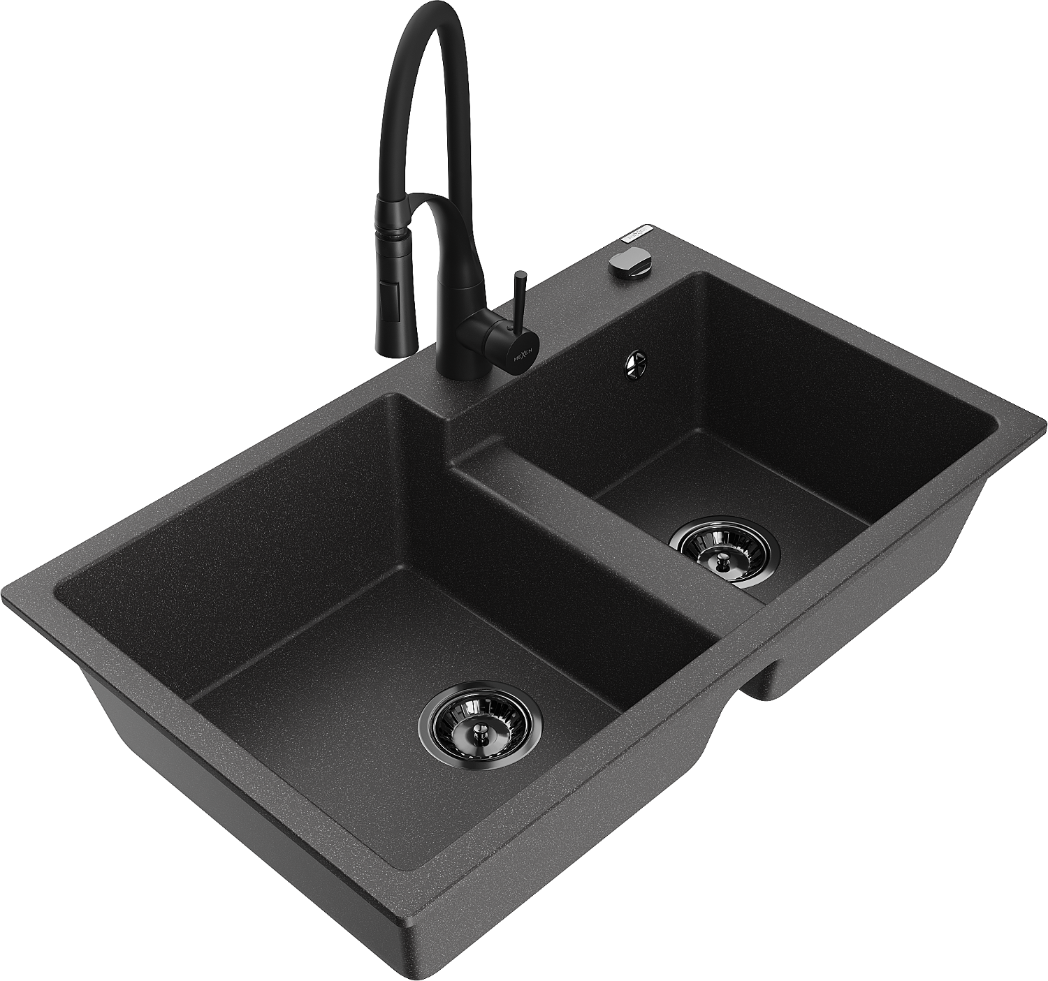 Mexen Tomas chiuvetă de granit cu 2 compartimente și baterie de bucătărie Aster, negru cu pete - 6516-76-73450-70-B