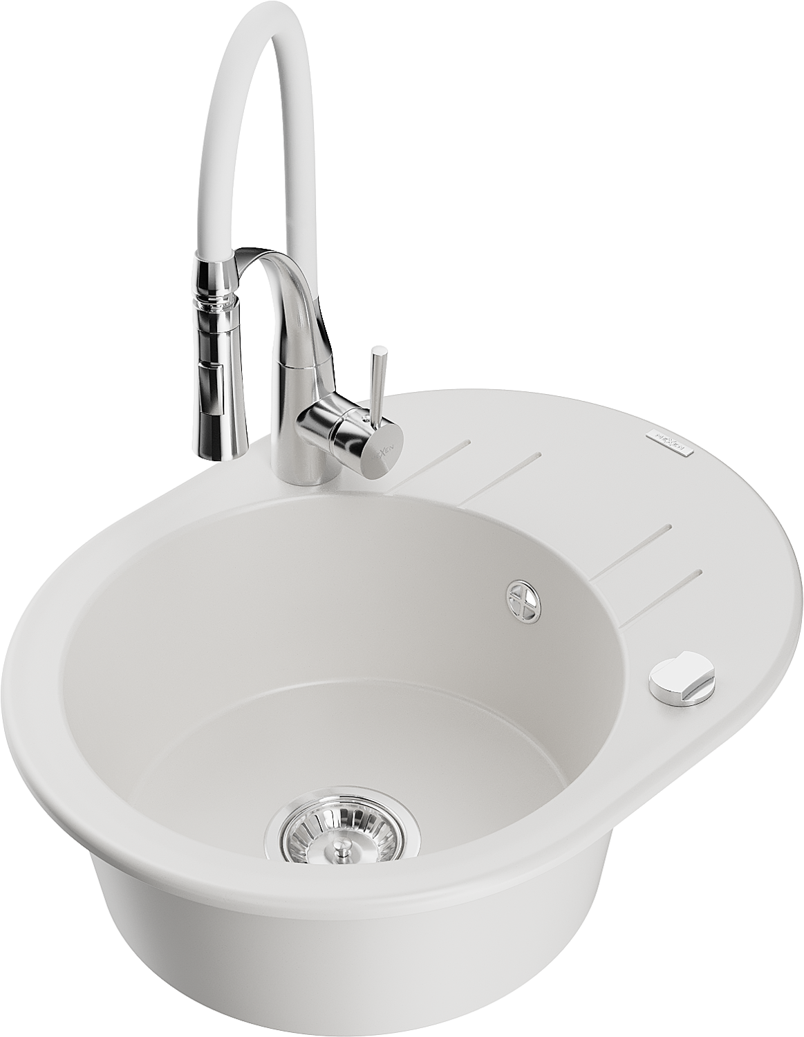 Mexen Kevin chiuvetă de granit cu o cuvă, cu scurgător și baterie de bucătărie Aster, alb - 6517-20-73450-02