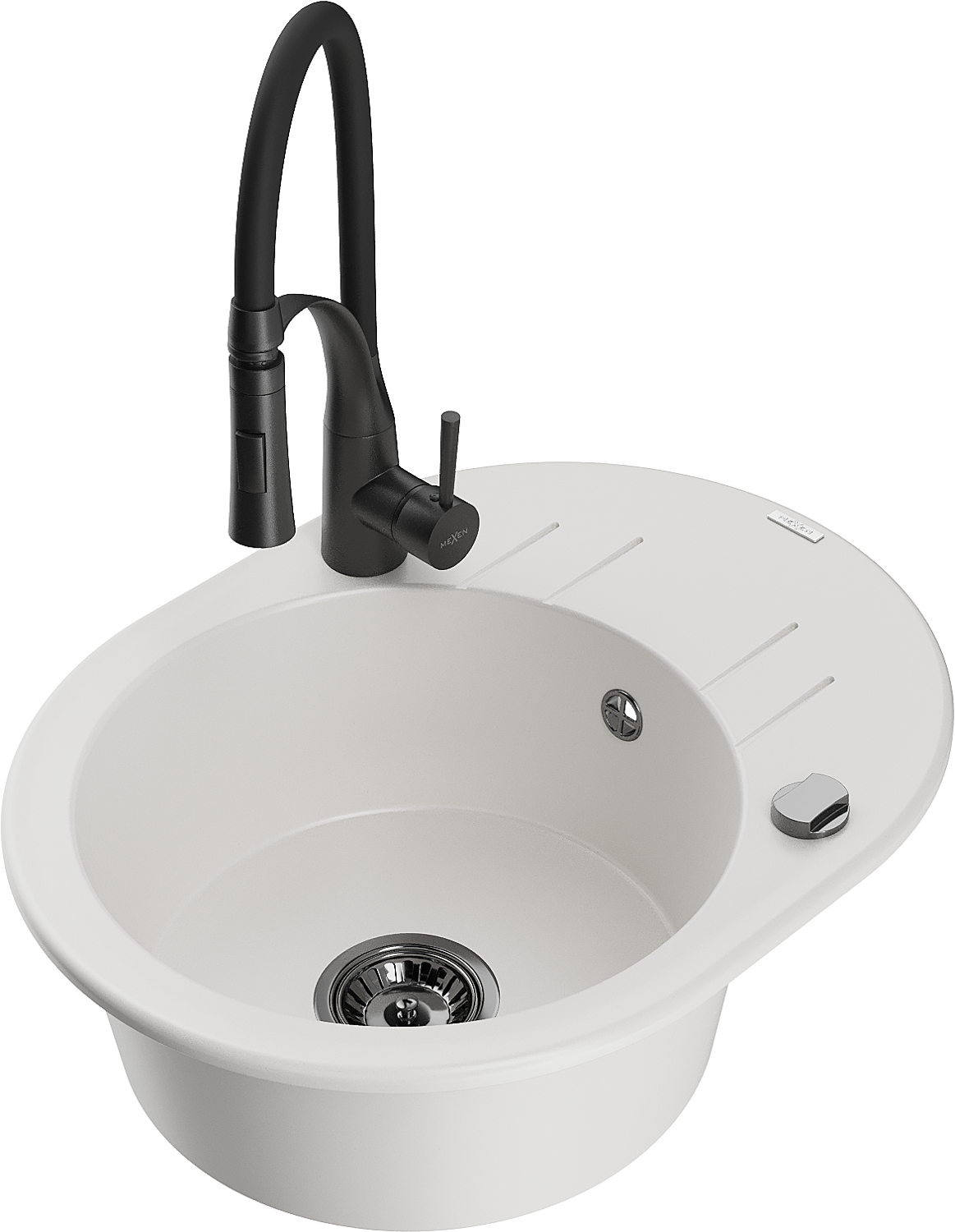 Mexen Kevin chiuvetă de granit cu 1 compartiment, cu scurgător și baterie de bucătărie Aster, alb - 6517-20-73450-70-B