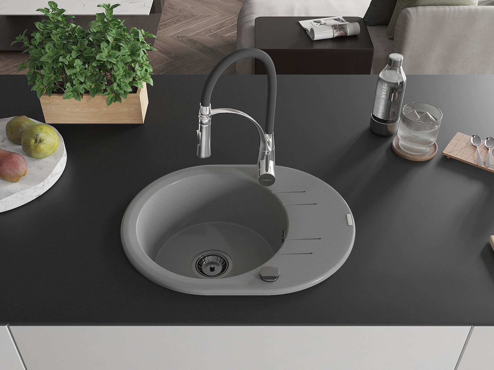 Mexen Kevin chiuvetă de granit cu o singură cuvă, cu scurgător și baterie de bucătărie Aster, gri - 6517-71-73450-07-B