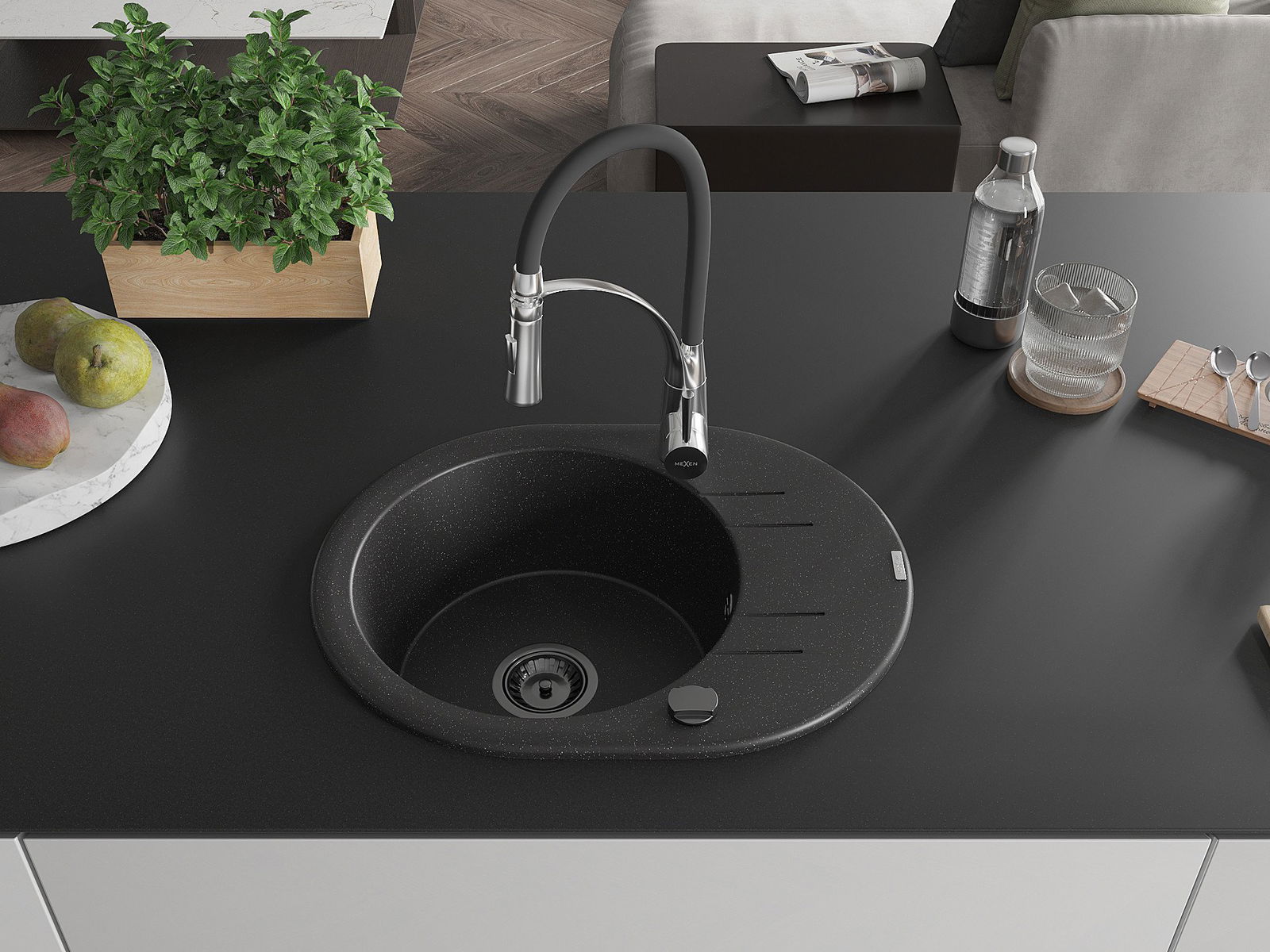 Mexen Kevin chiuvetă de bucătărie din granit cu 1 cuvă, cu scurgător și baterie de bucătărie Aster, negru/argintiu