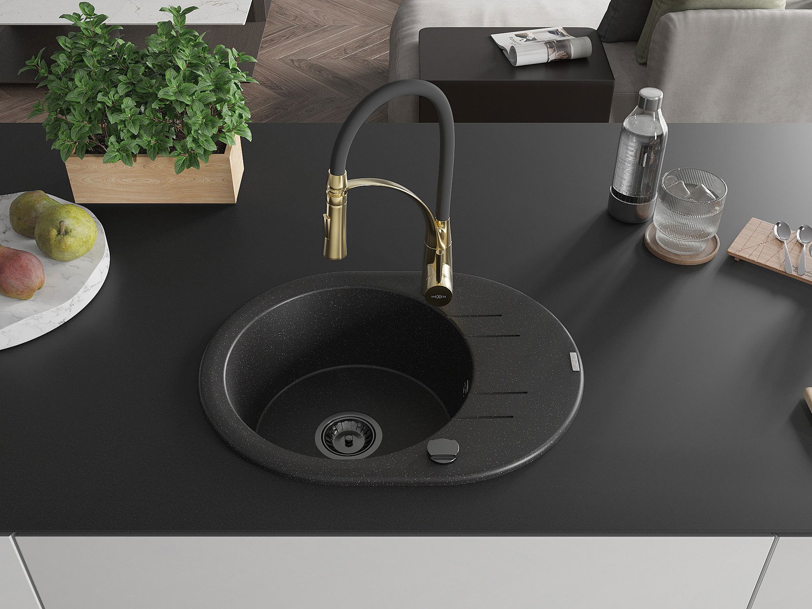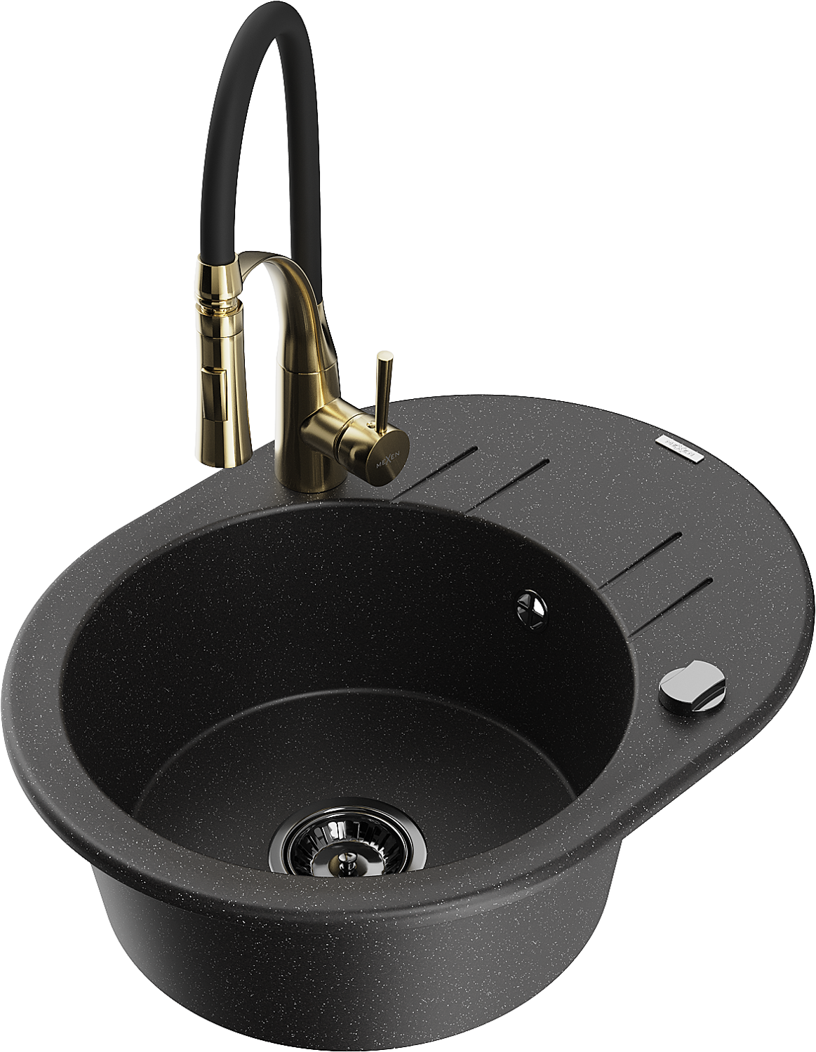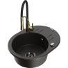 Mexen Kevin chiuvetă de granit cu 1 compartiment cu scurgător și baterie de bucătărie Aster, negru/argintiu metalizat