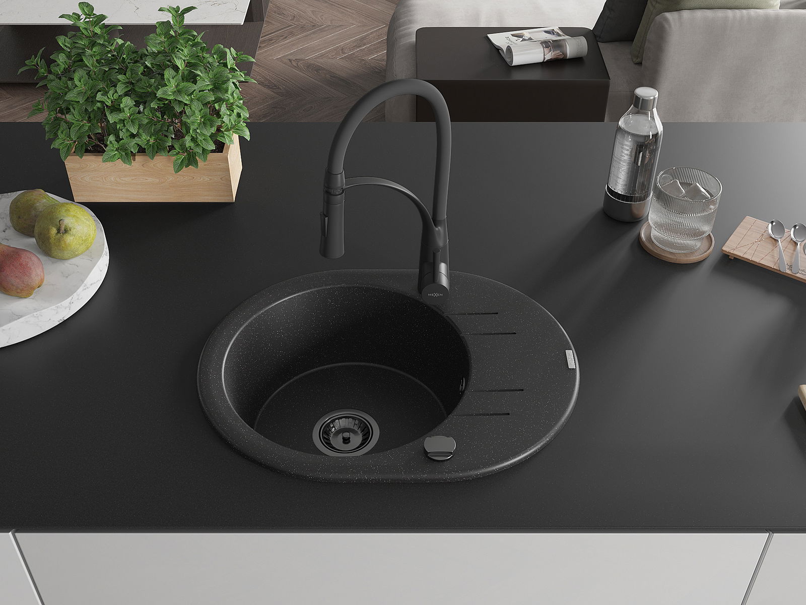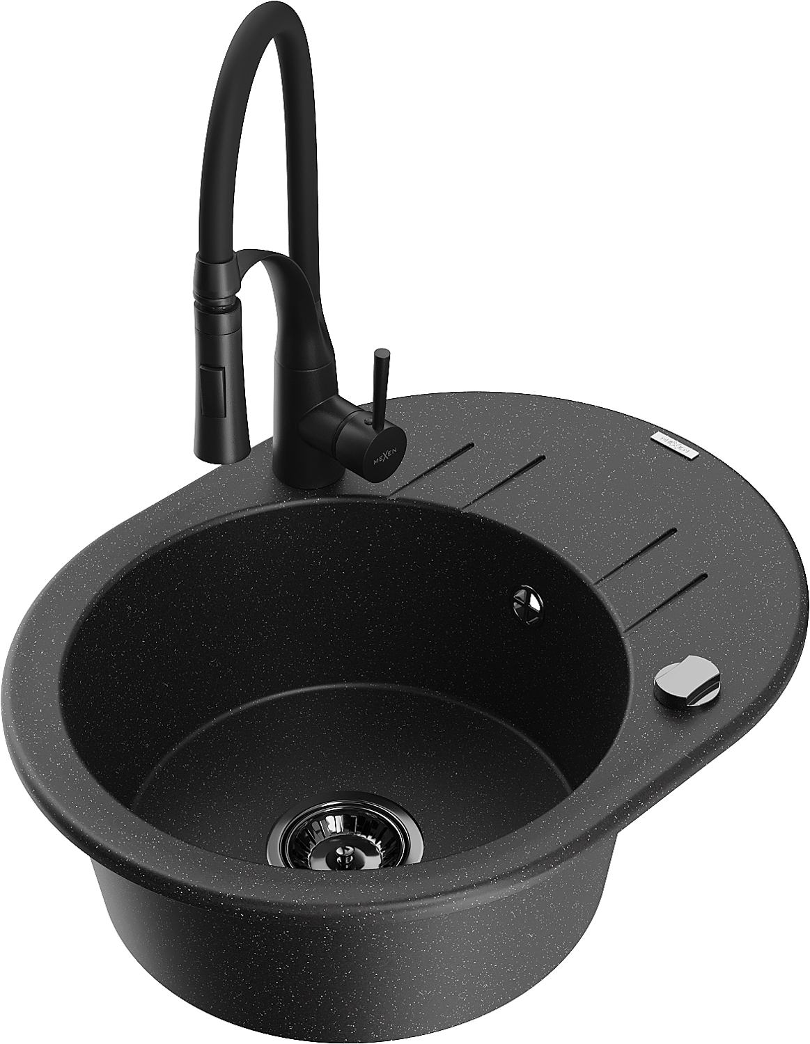 Mexen Kevin chiuvetă de bucătărie din granit cu 1 cuvă, cu scurgător și baterie bucătărie Aster, negru/metalizat argintiu - 651?