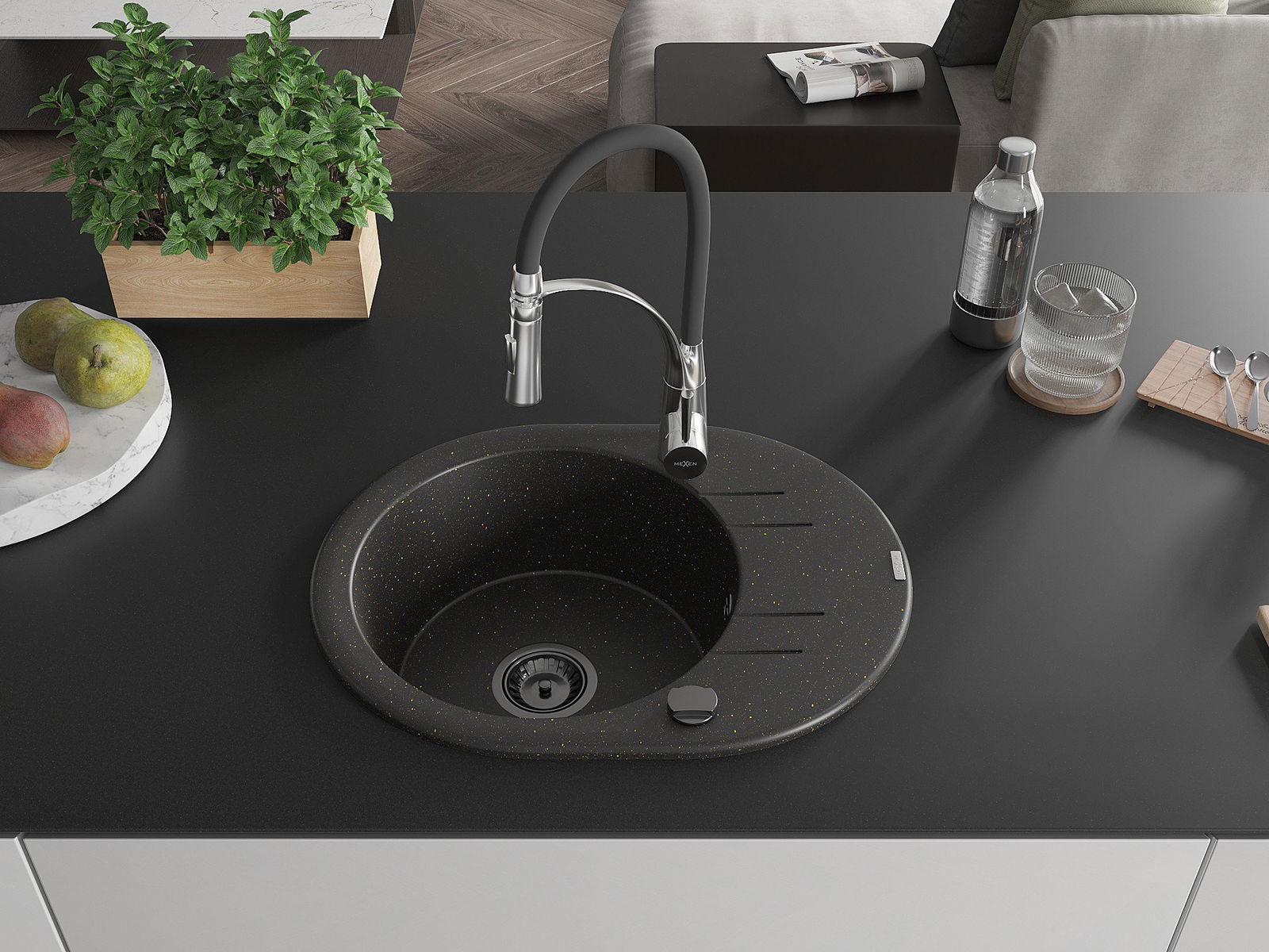Mexen Kevin chiuvetă din granit cu 1 compartiment cu picurător și baterie de bucătărie Aster, negru/auriu metalizat