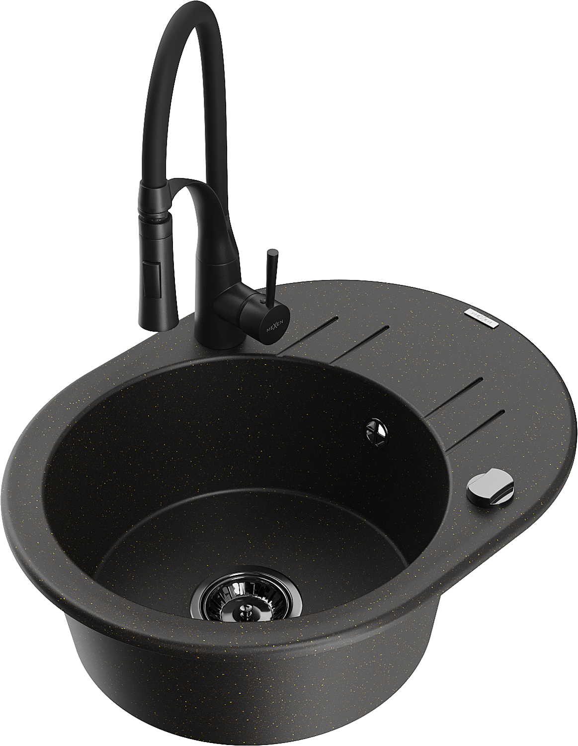 Mexen Kevin chiuvetă de granit cu 1 compartiment și scurgător și baterie de bucătărie Aster, negru/metalizată aurie
