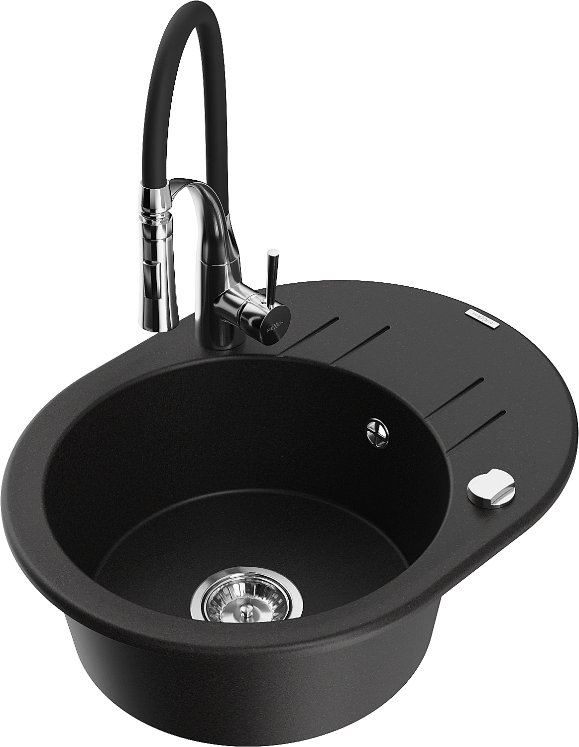 Mexen Kevin chiuvetă de granit cu o cuvă și scurgător și robinet de bucătărie Aster, negru - 6517-77-73450-07