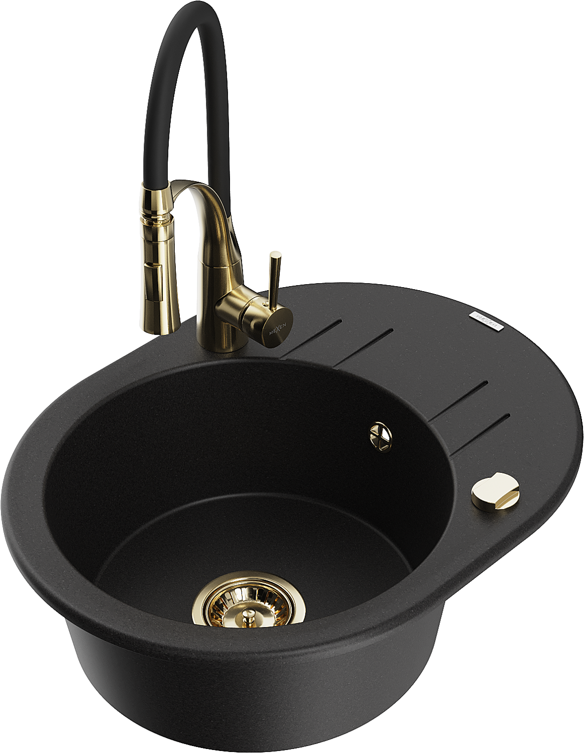Mexen Kevin chiuvetă de granit cu 1 cuvă și scurgător și baterie de bucătărie Aster, negru - 6517-77-73450-57-G