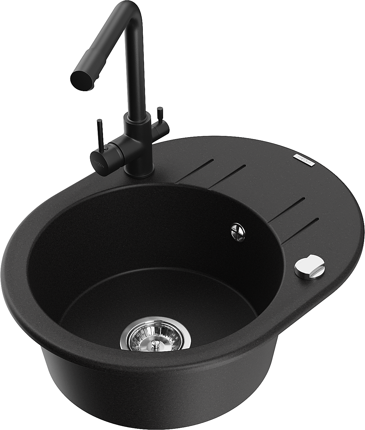 Mexen Kevin chiuvetă de granit cu 1 compartiment, scurgător și baterie de bucătărie Duero, negru - 6517-77-671600-70