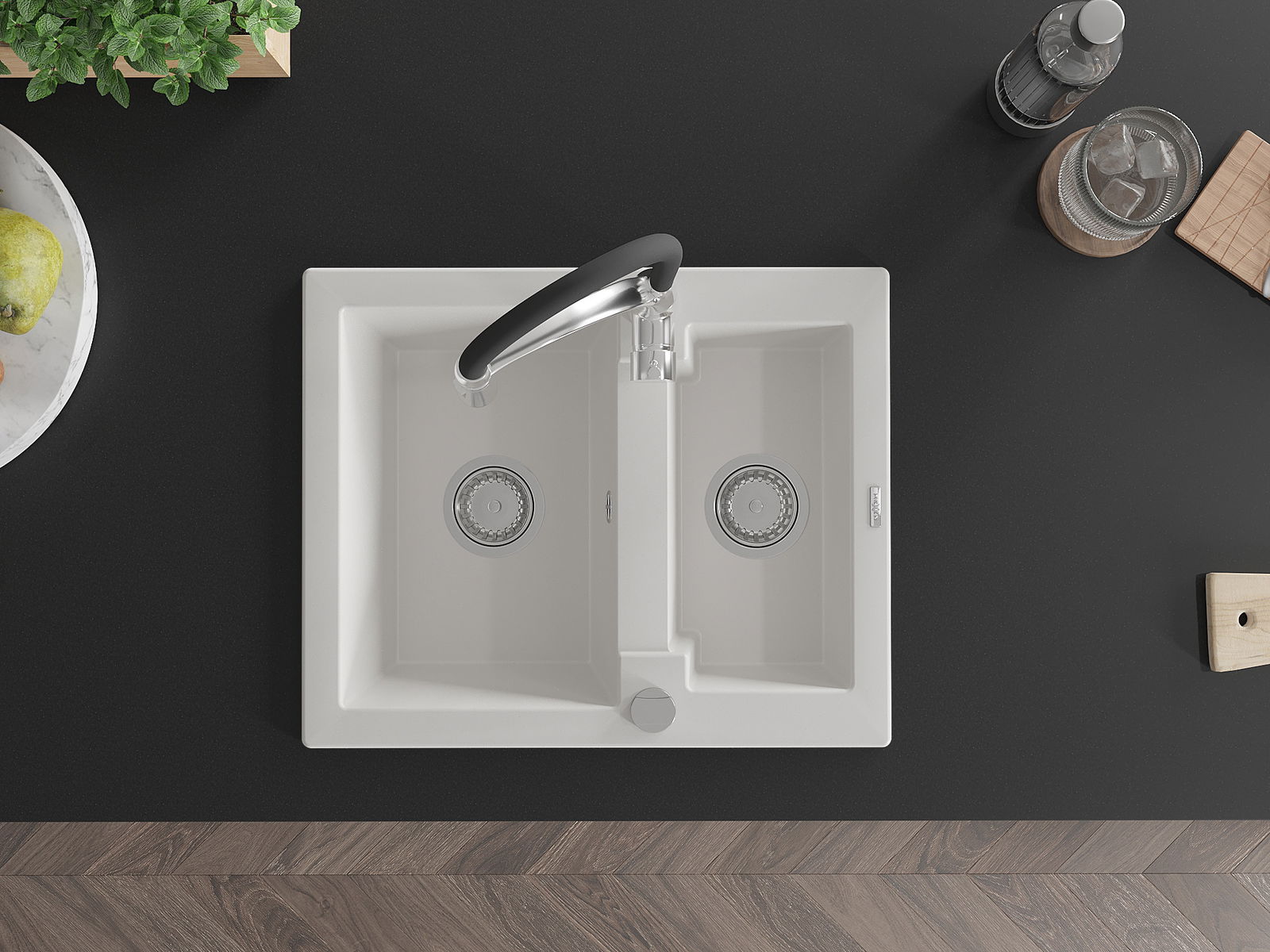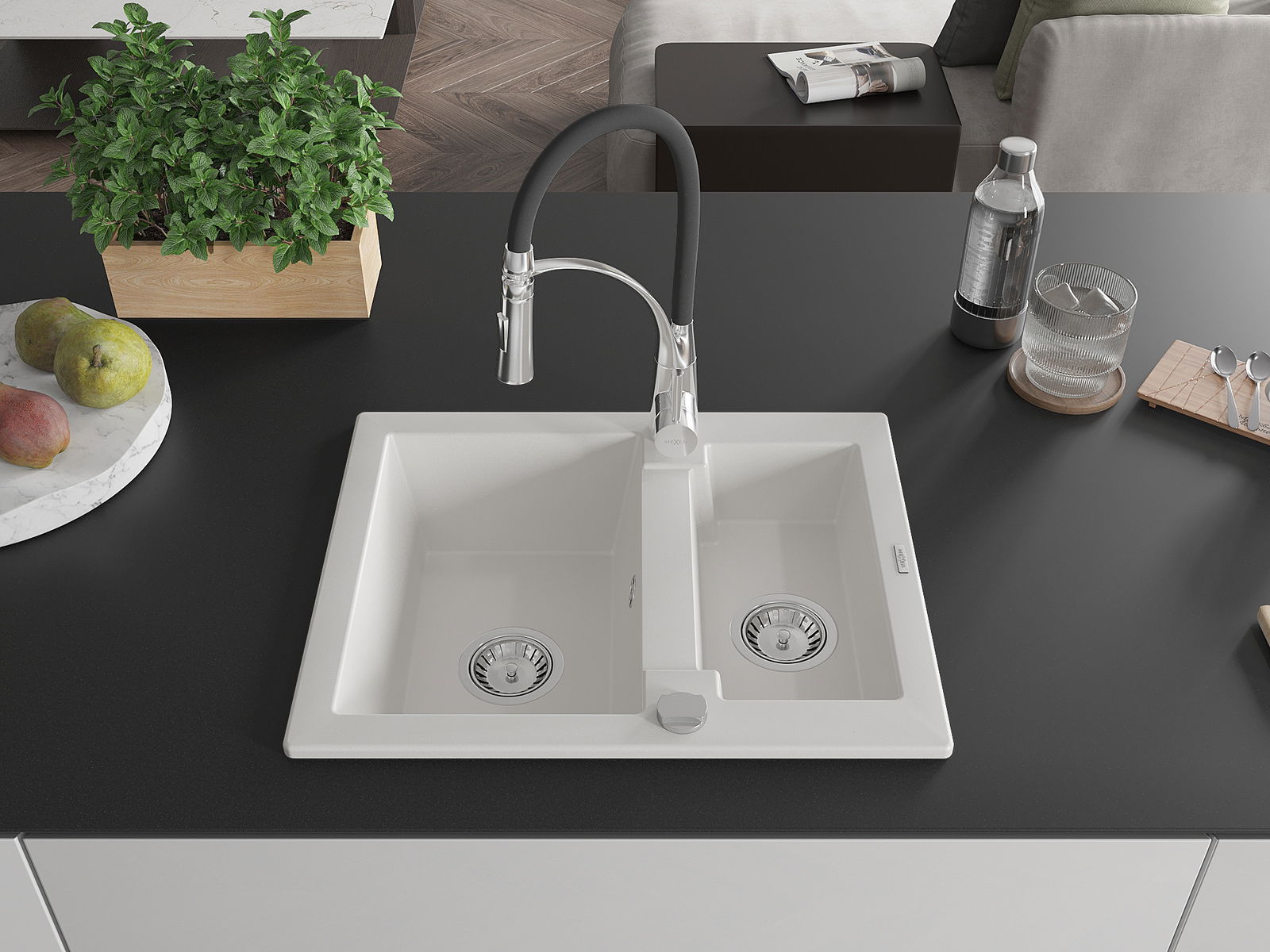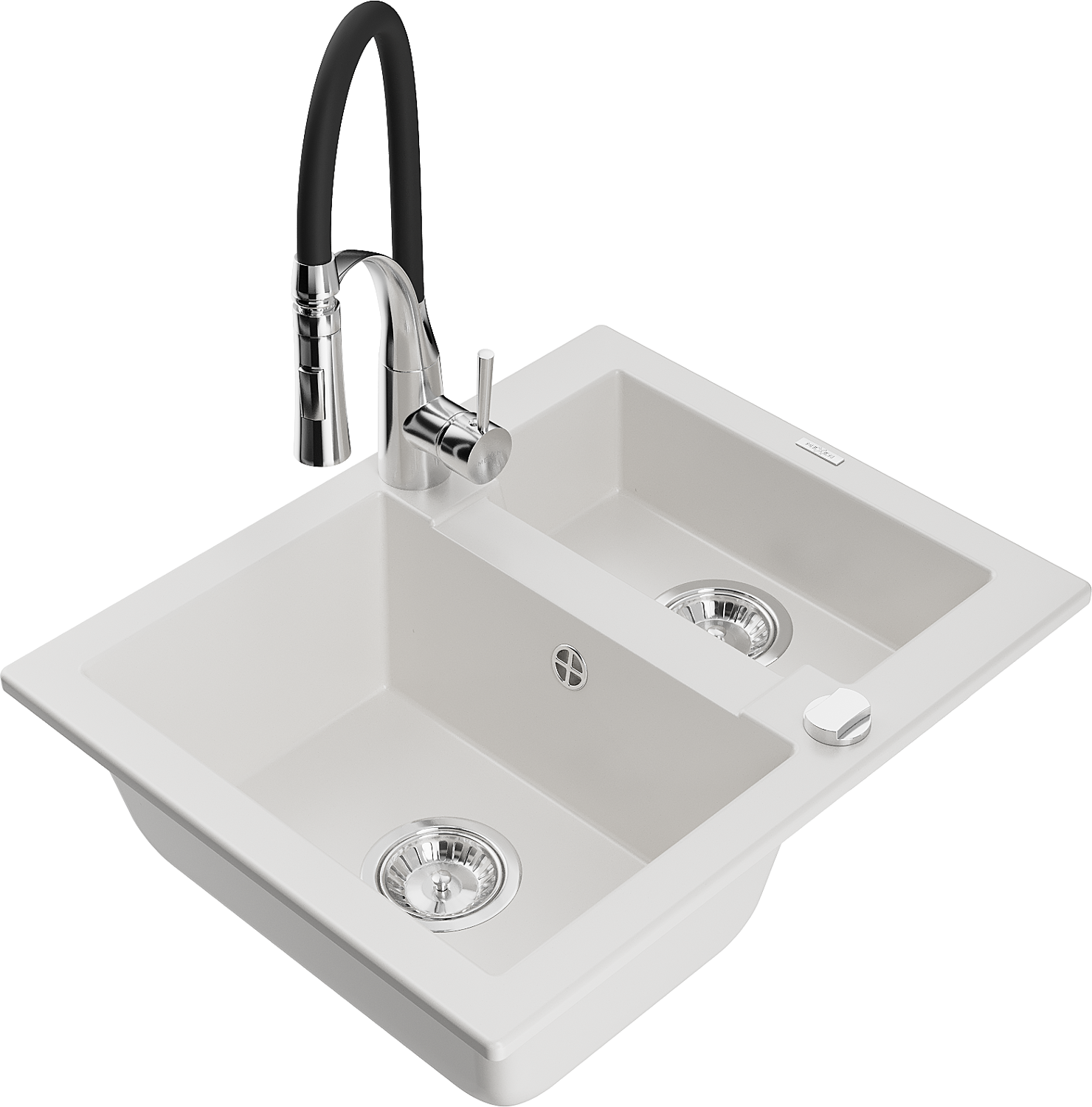 Mexen Carlos chiuvetă de bucătărie din granit 1,5 compartimente cu baterie de bucătărie Aster, alb - 6518-20-73450-07