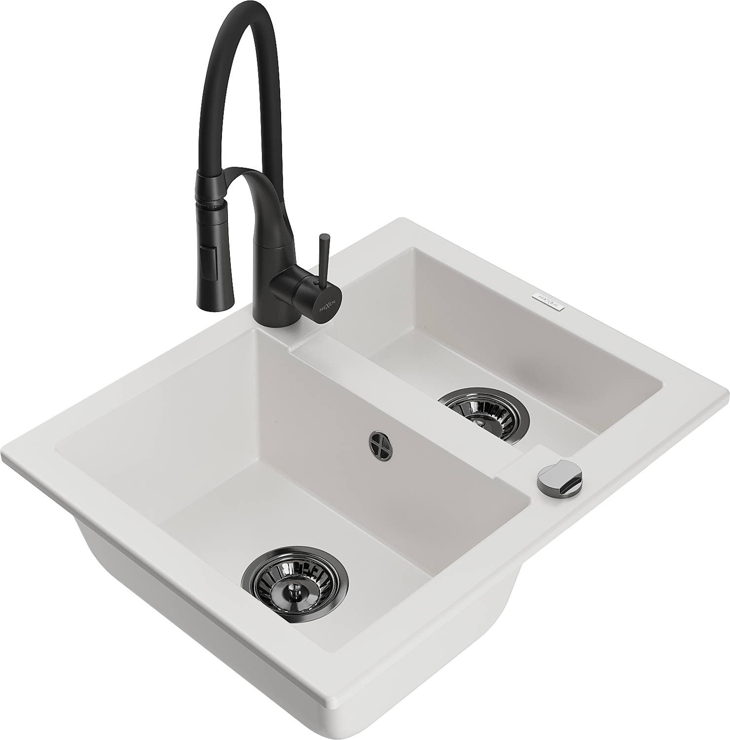 Mexen Carlos chiuvetă din granit cu 1,5 compartimente și baterie de bucătărie Aster, alb - 6518-20-73450-70-B