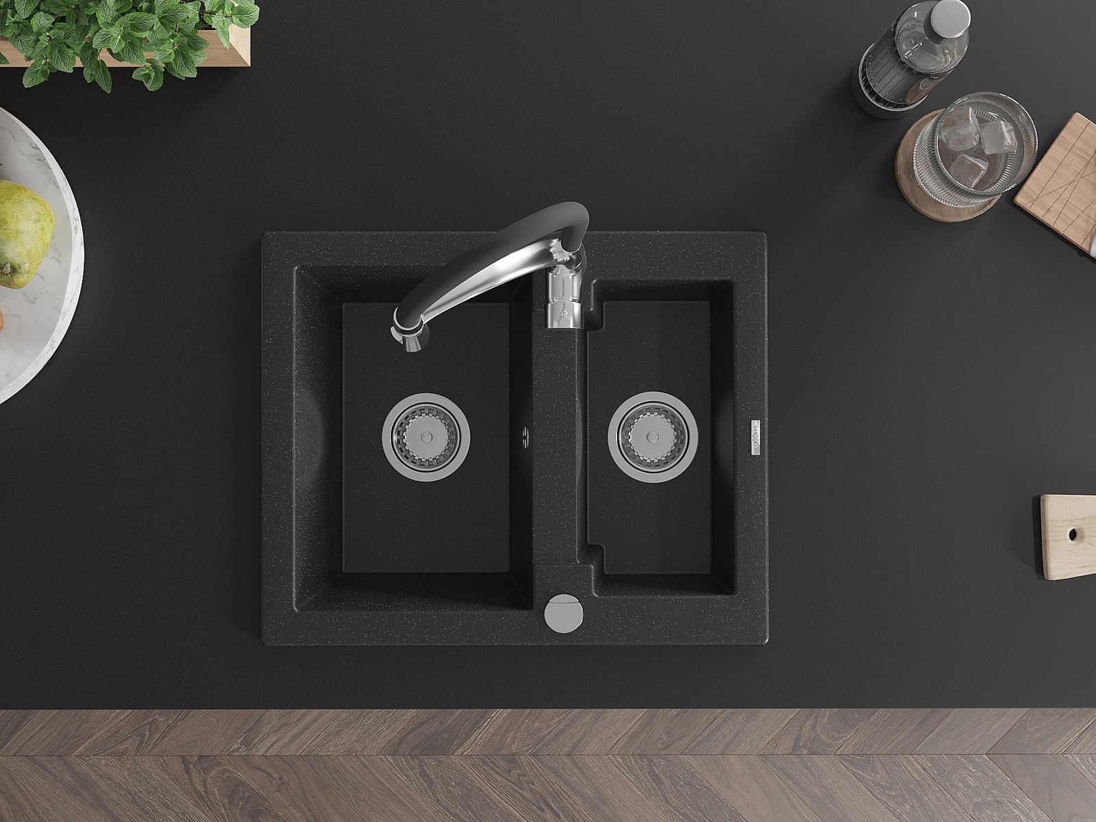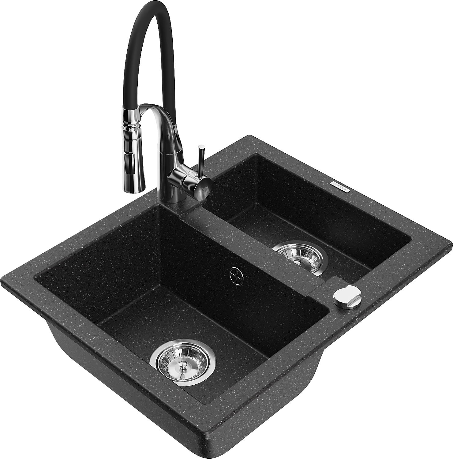 Mexen Carlos chiuvetă de granit 1,5 compartimente cu baterie de bucătărie Aster, negru/argintiu metalic - 6518-73-73450-07