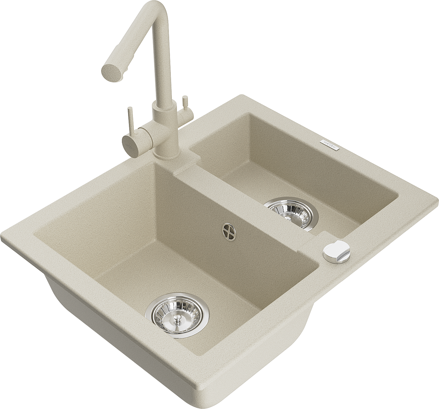 Mexen Carlos chiuvetă de bucătărie din granit, cu 1,5 cuve, cu baterie de bucătărie Duero, bej - 6518-69-671600-69