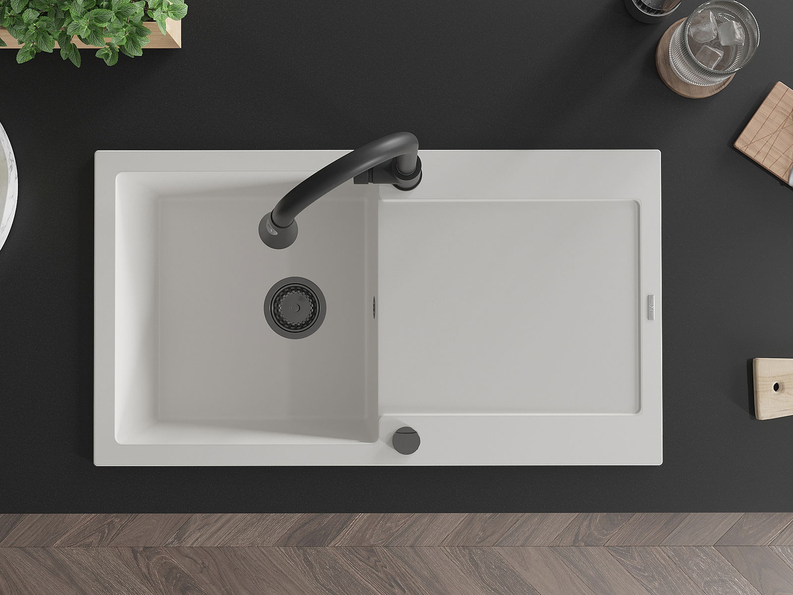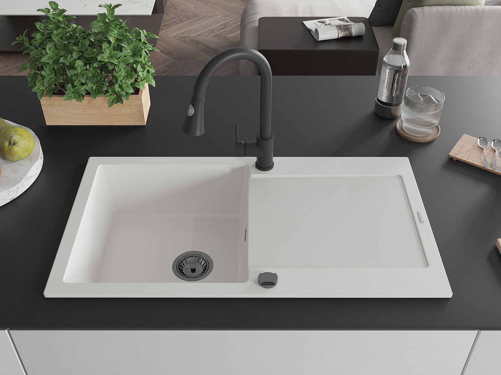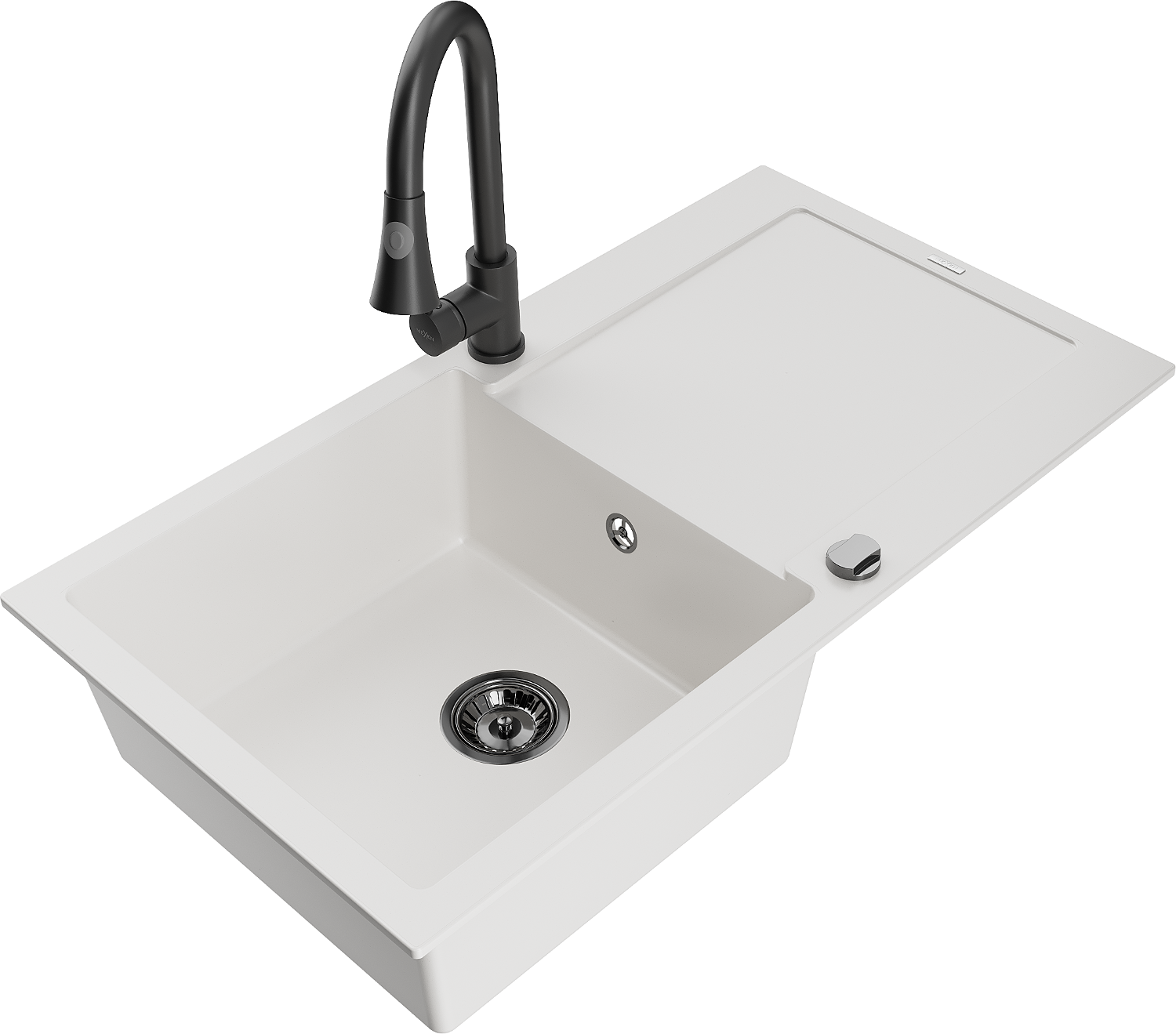 Mexen Leo chiuvetă de granit cu o cuvă și scurgător și baterie de bucătărie Elia, alb - 6501-20-670101-70