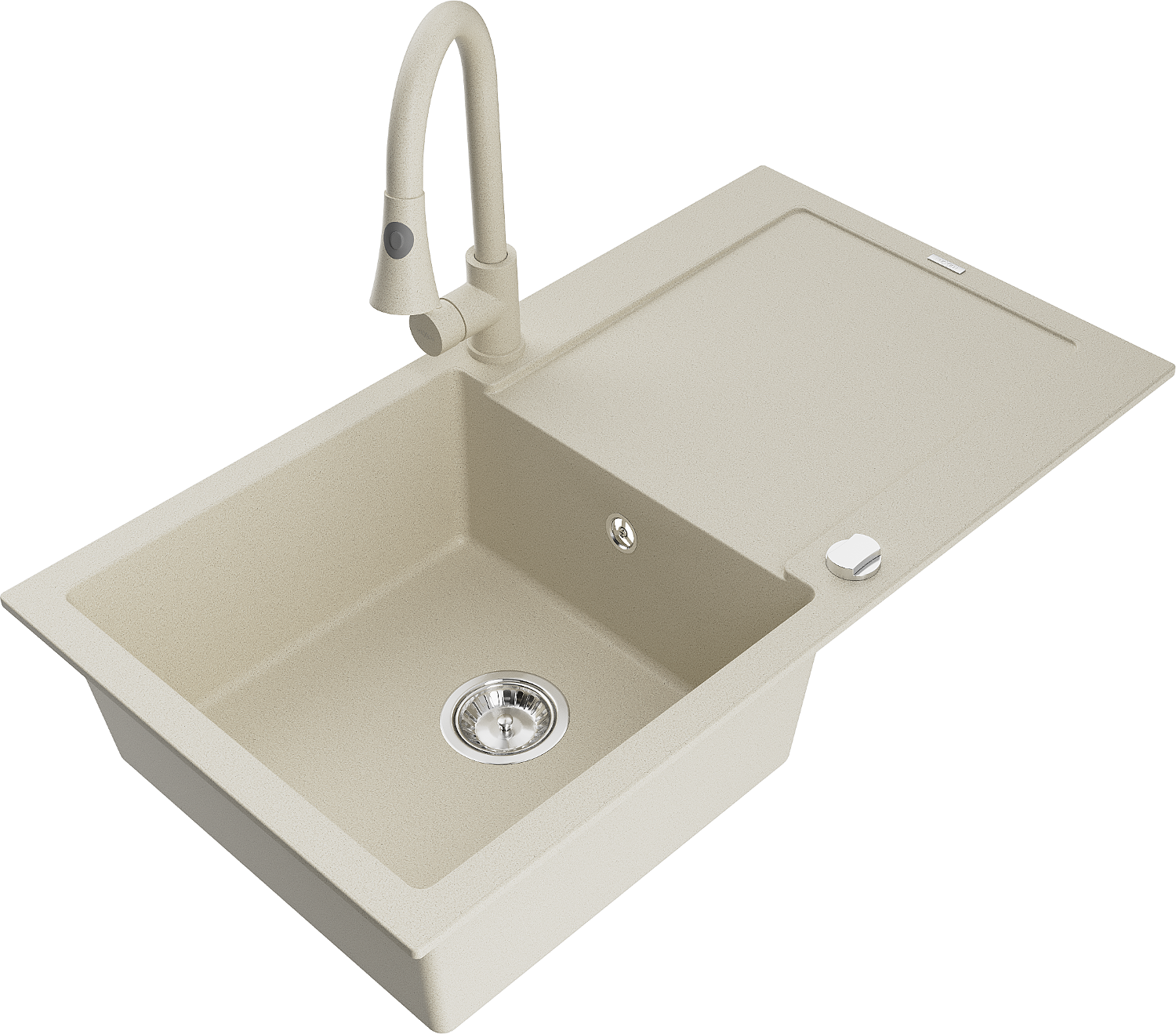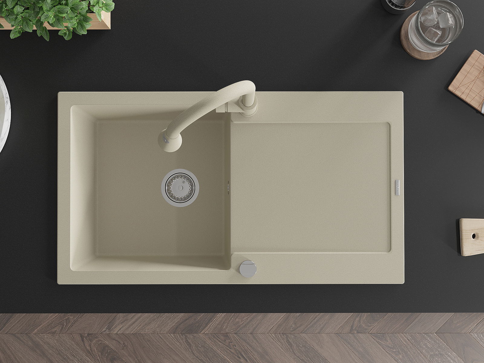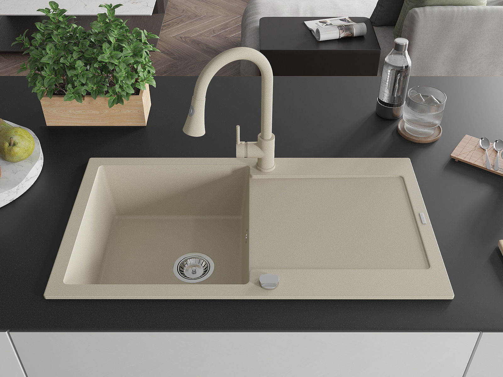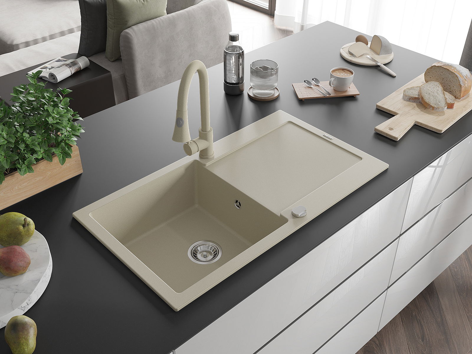 Mexen Leo chiuvetă de granit cu 1 compartiment și scurgător și baterie de bucătărie Elia, bej - 6501-69-670101-69