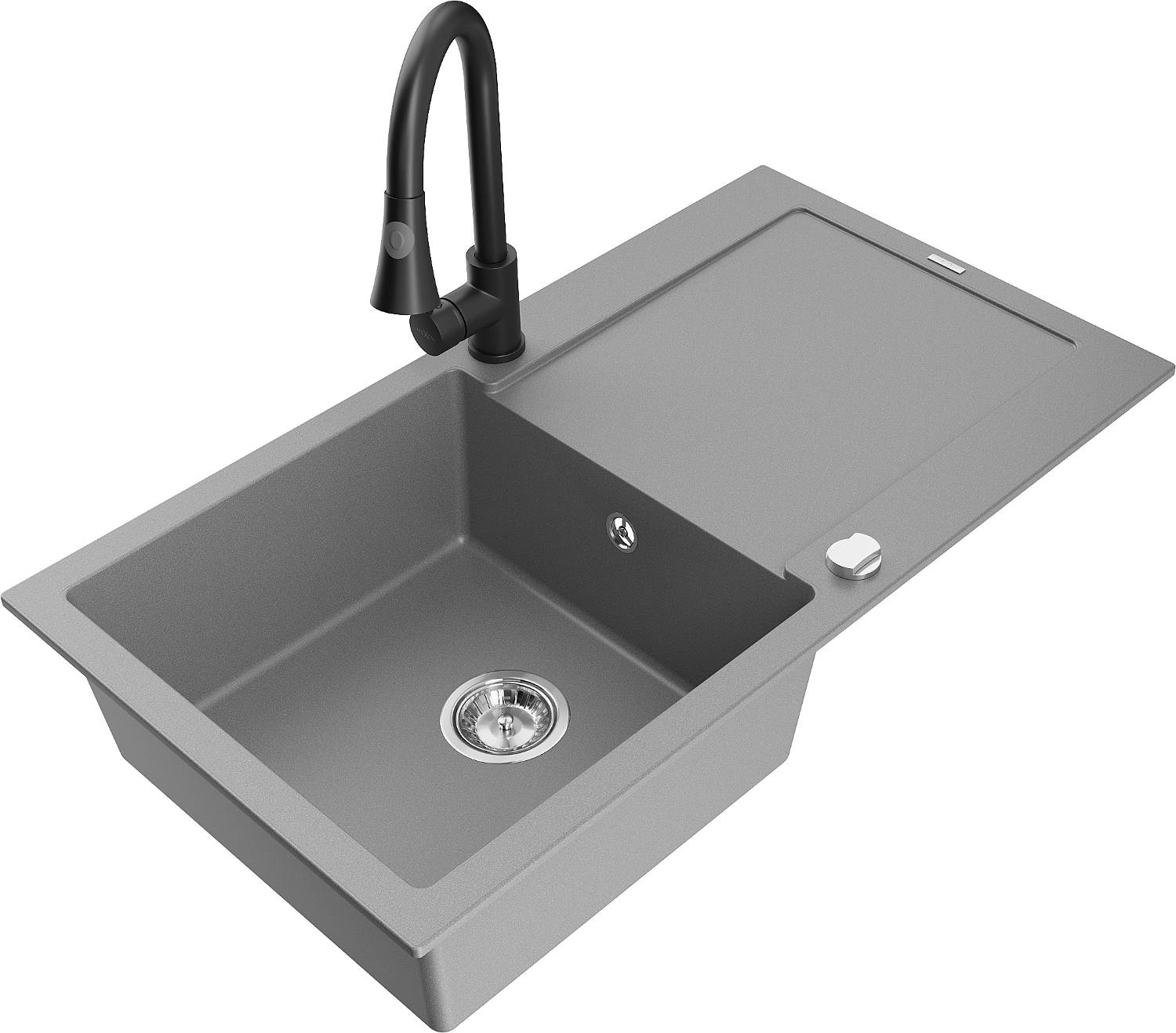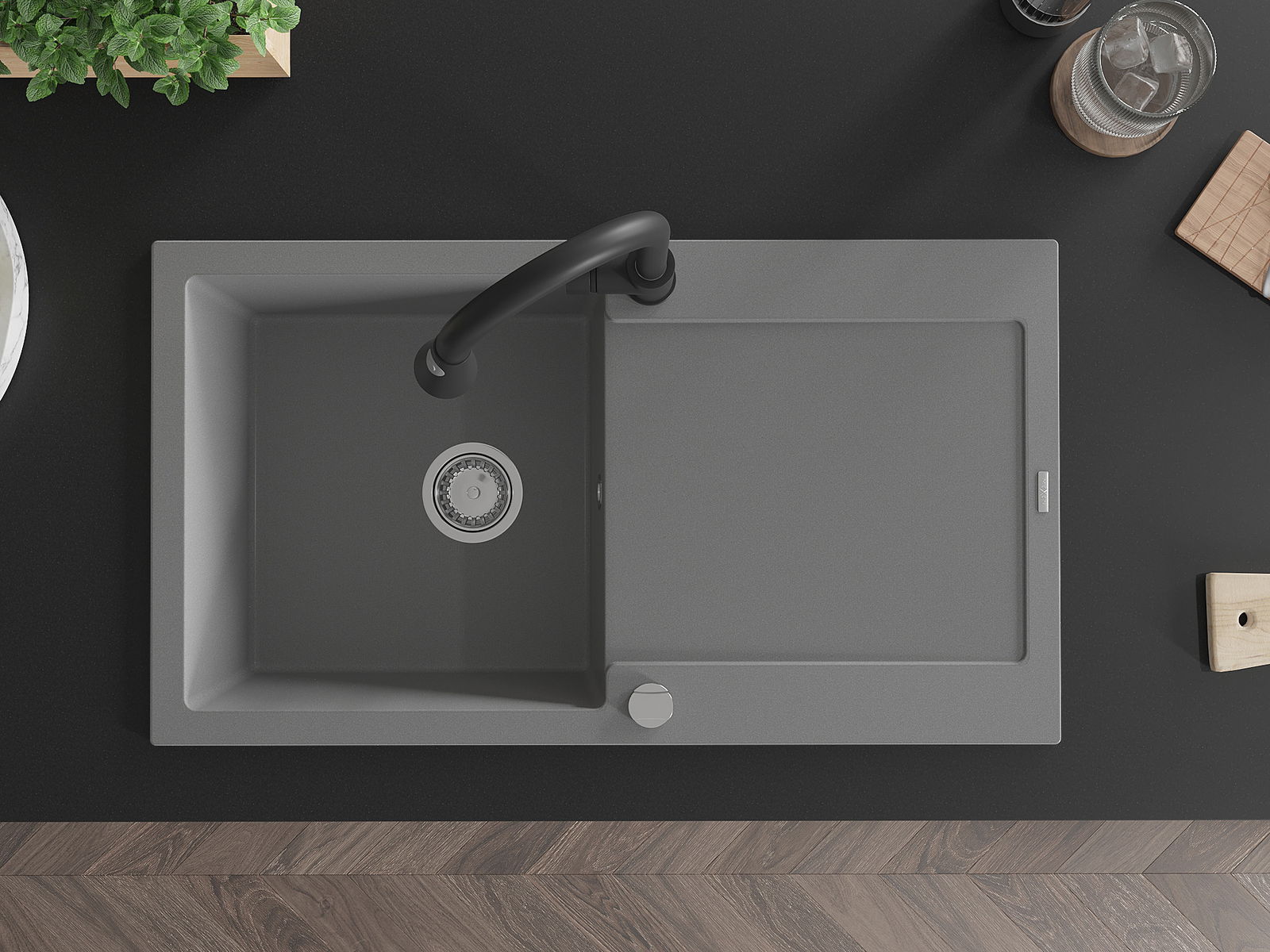 Mexen Leo chiuvetă de granit cu 1 compartiment și scurgător și baterie de bucătărie Elia, gri - 6501-71-670101-70
