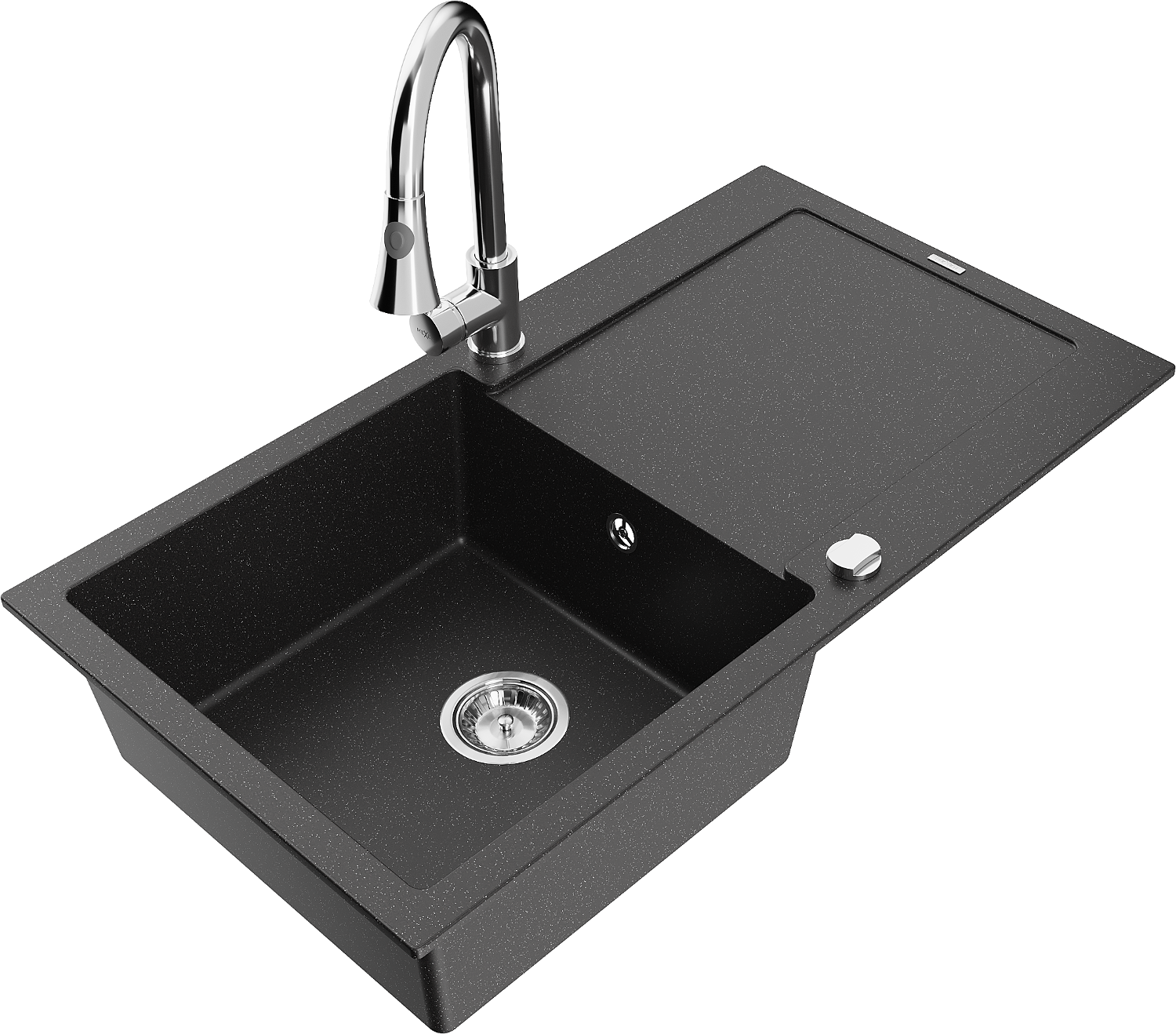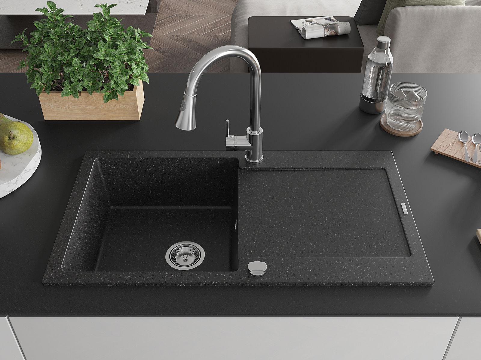 Mexen Leo chiuvetă de bucătărie din granit cu 1 compartiment, cu picurător și baterie Elia, negru/metalizat argintiu