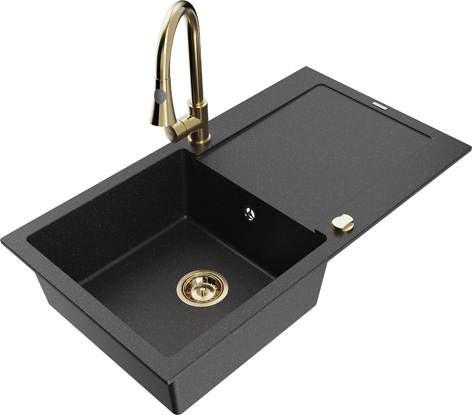 Mexen Leo chiuvetă de granit cu o singură cuvă cu scurgător și baterie de bucătărie Elia, negru/metalic argintiu
