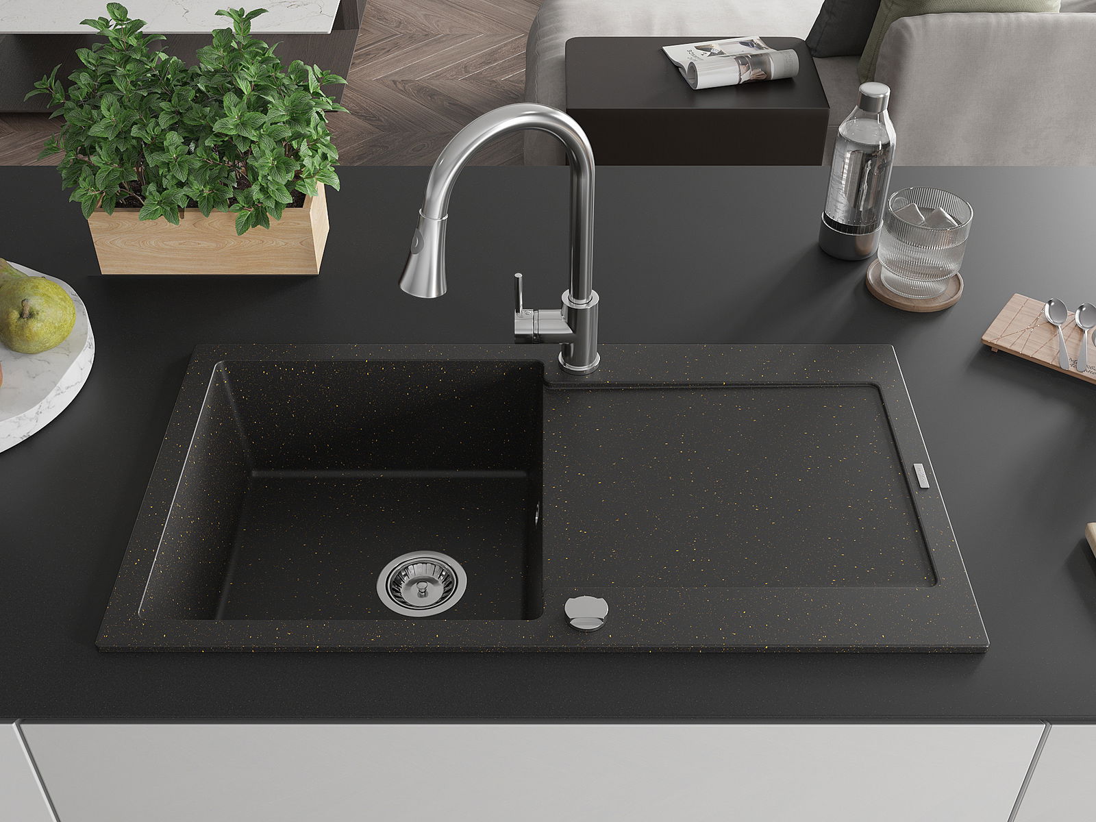 Mexen Leo chiuvetă de granit cu o cuvă și scurgător și robinet de bucătărie Elia, negru/auriu metalic - 6501-75-670101-00