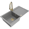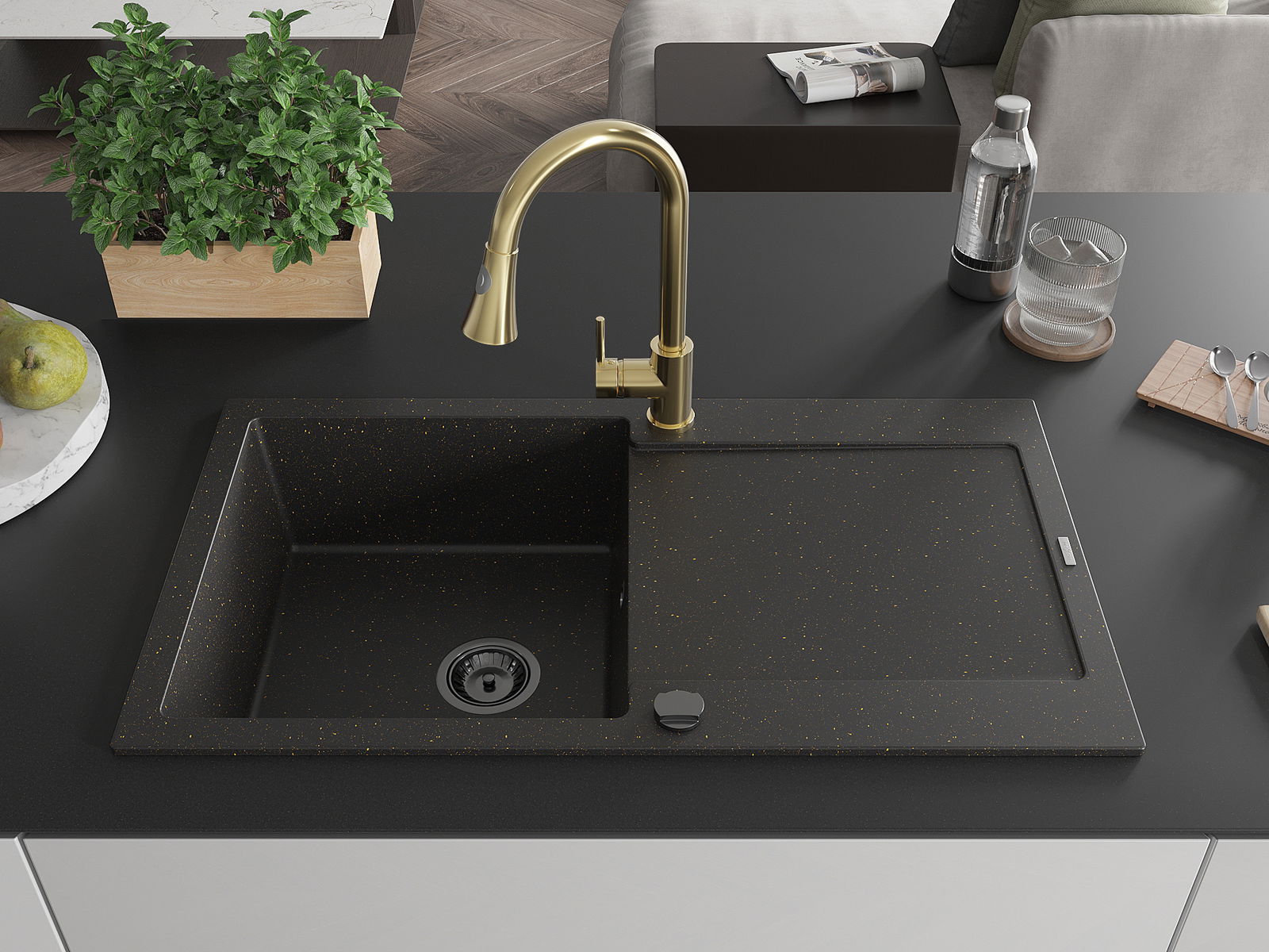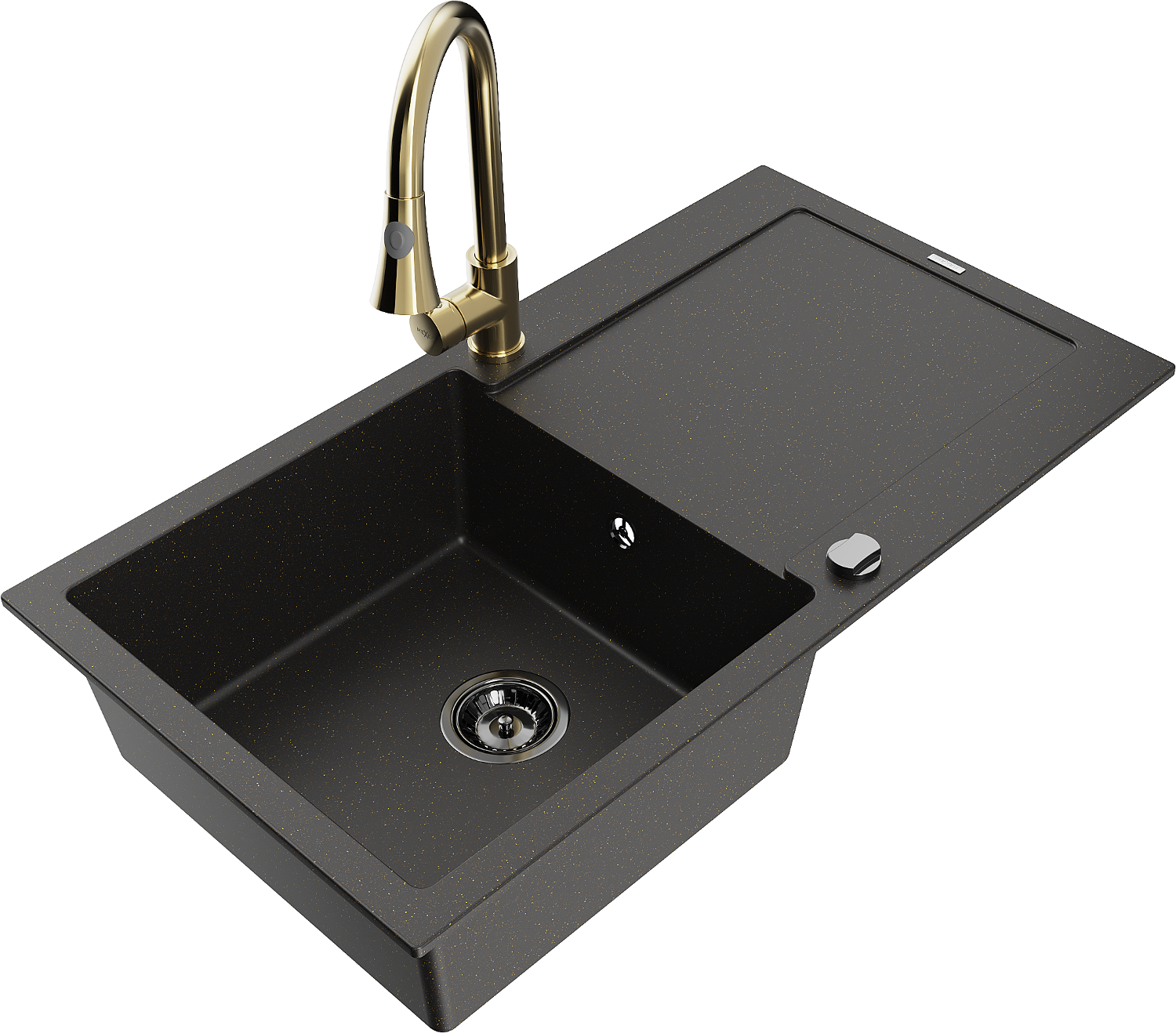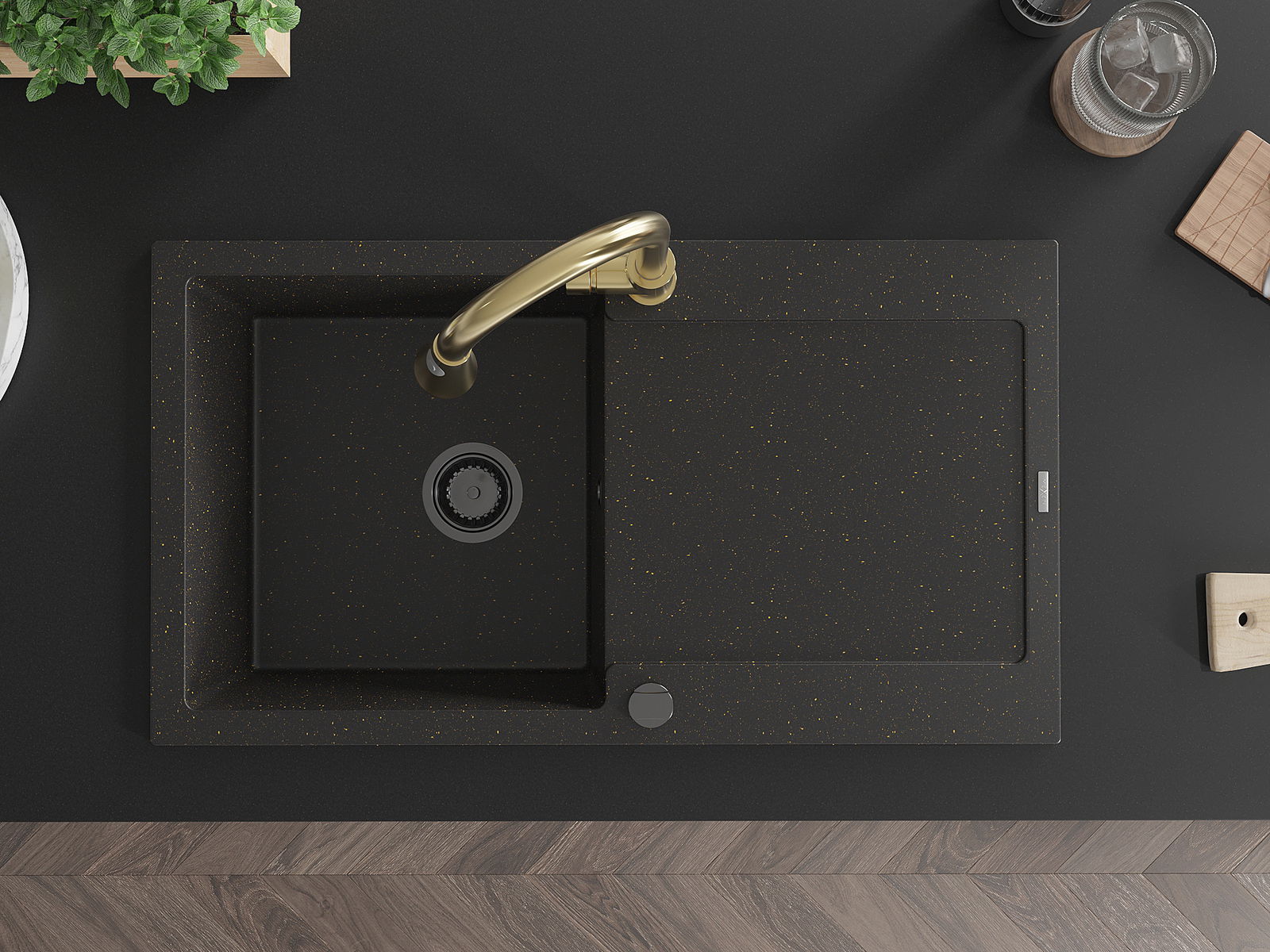 Mexen Leo chiuvetă de bucătărie din granit cu 1 compartiment cu scurgător și baterie de bucătărie Elia, negru/auriu