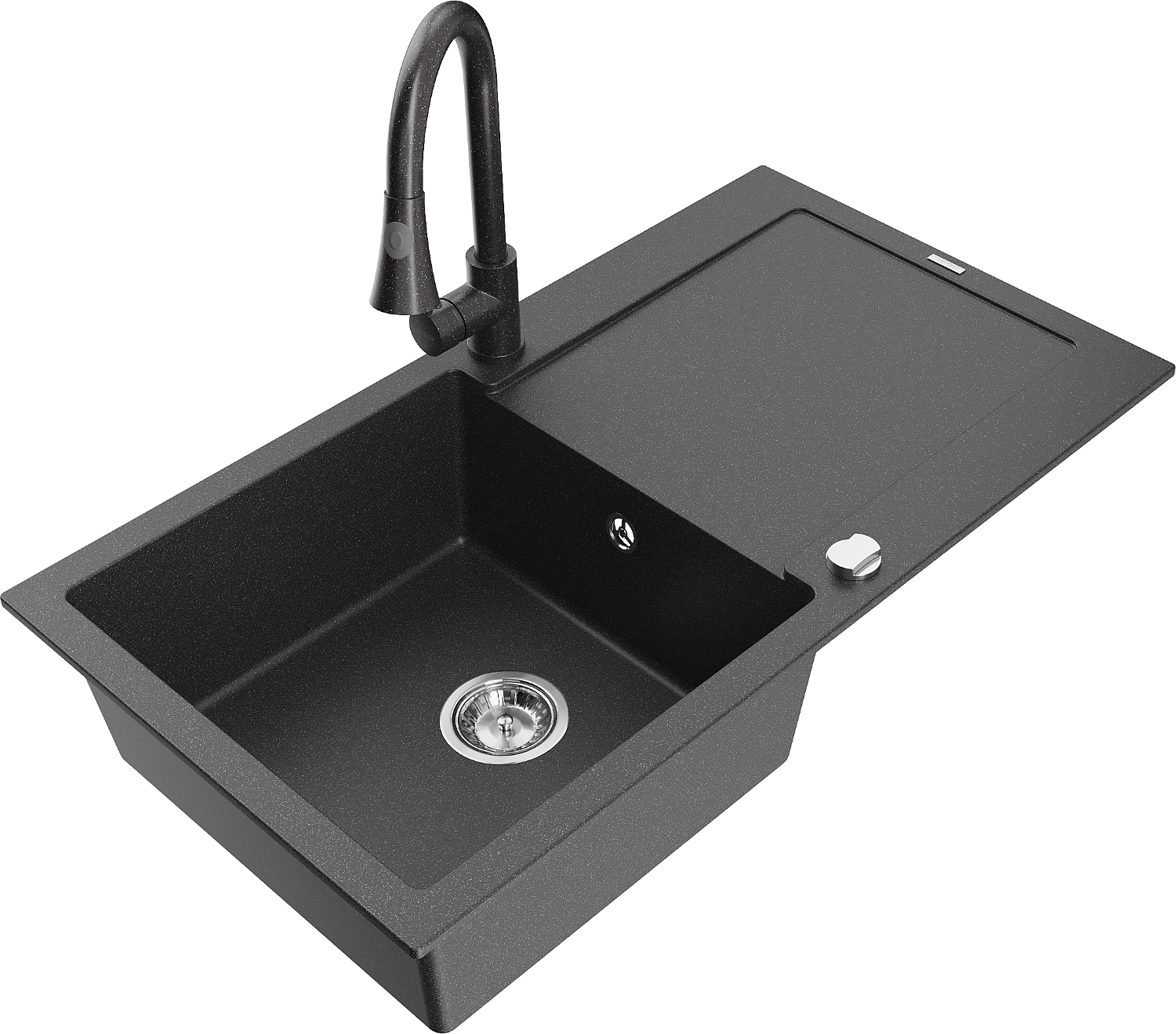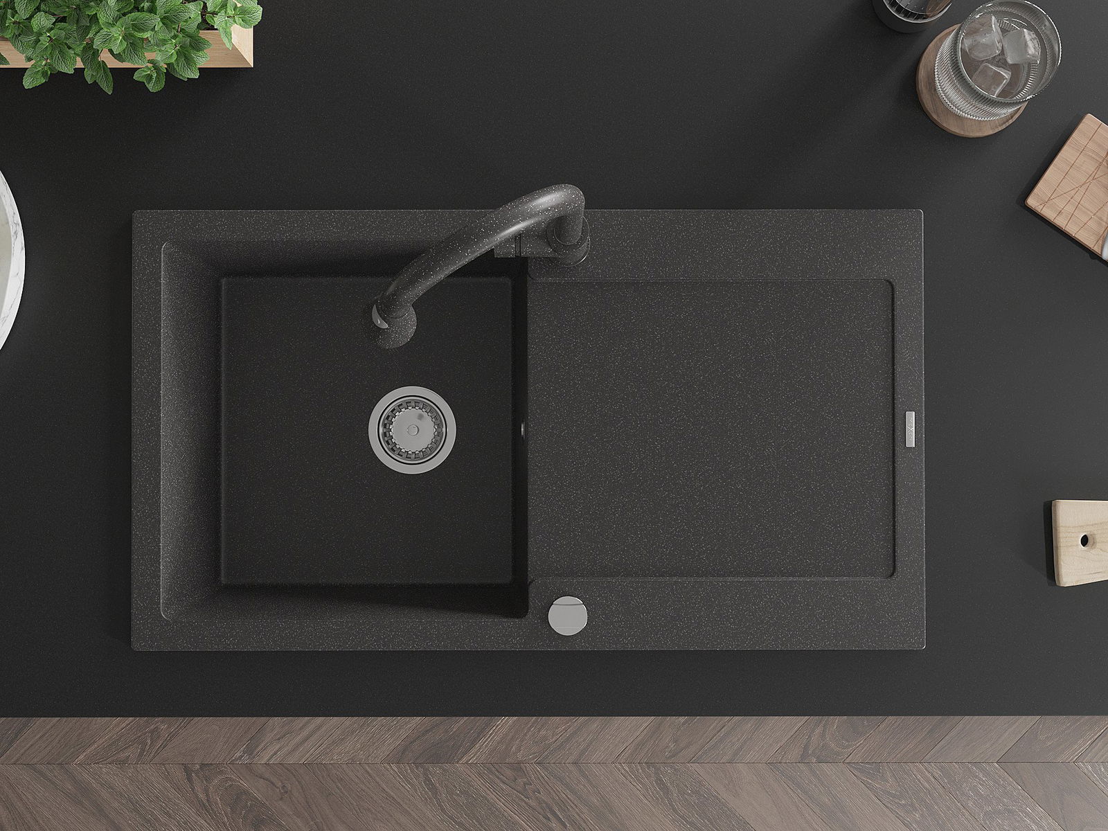 Mexen Leo chiuvetă de bucătărie din granit, cu o singură cuvă, cu scurgător și baterie Elia, negru pătat
