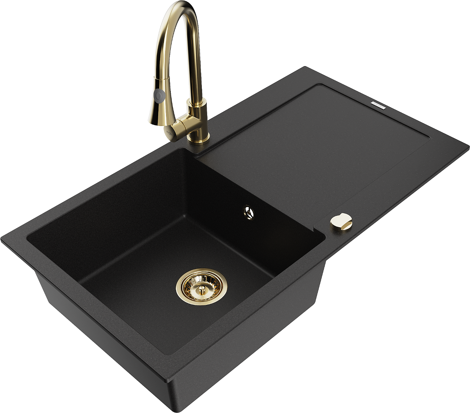 Mexen Leo chiuvetă de granit cu 1 compartiment cu scurgător și baterie de bucătărie Elia, negru - 6501-77-670101-50