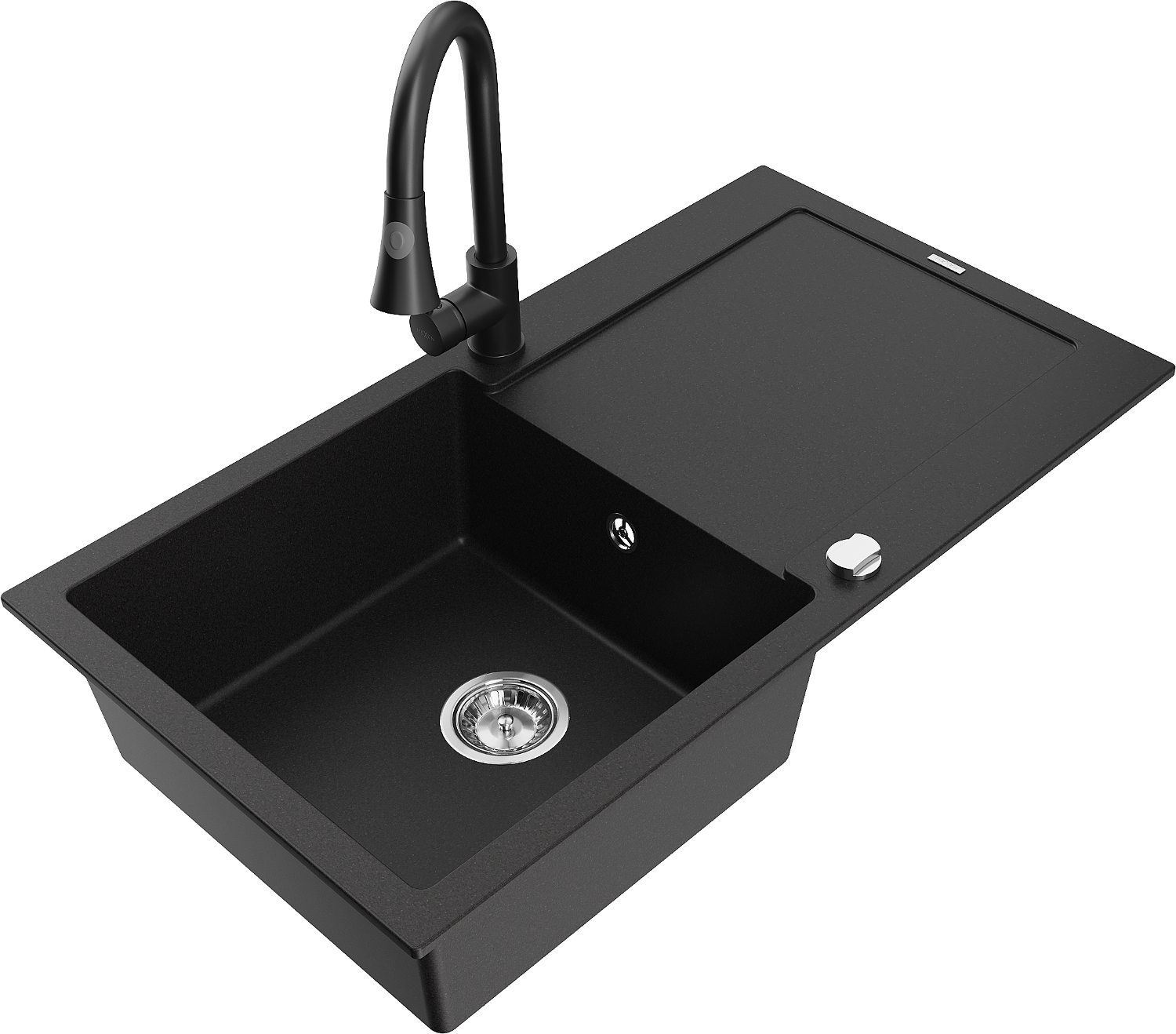 Mexen Leo chiuvetă de bucătărie din granit cu 1 compartiment și scurgător și baterie Elia, negru - 6501-77-670101-70