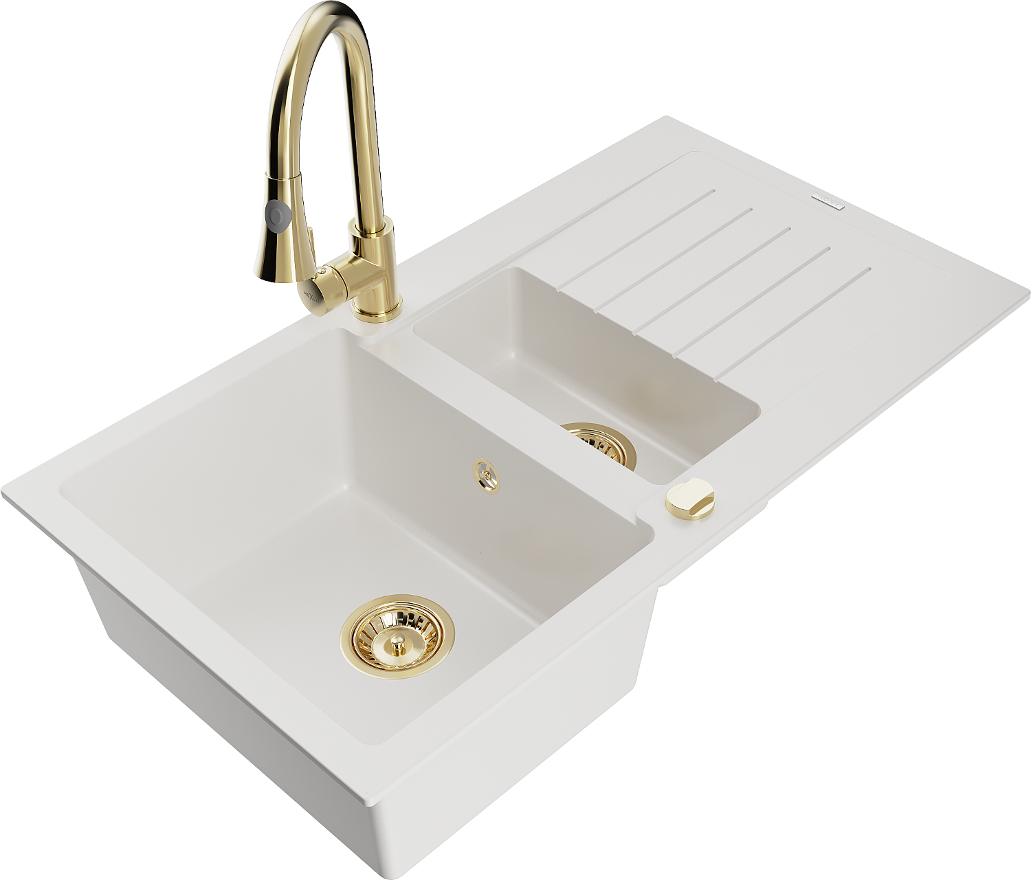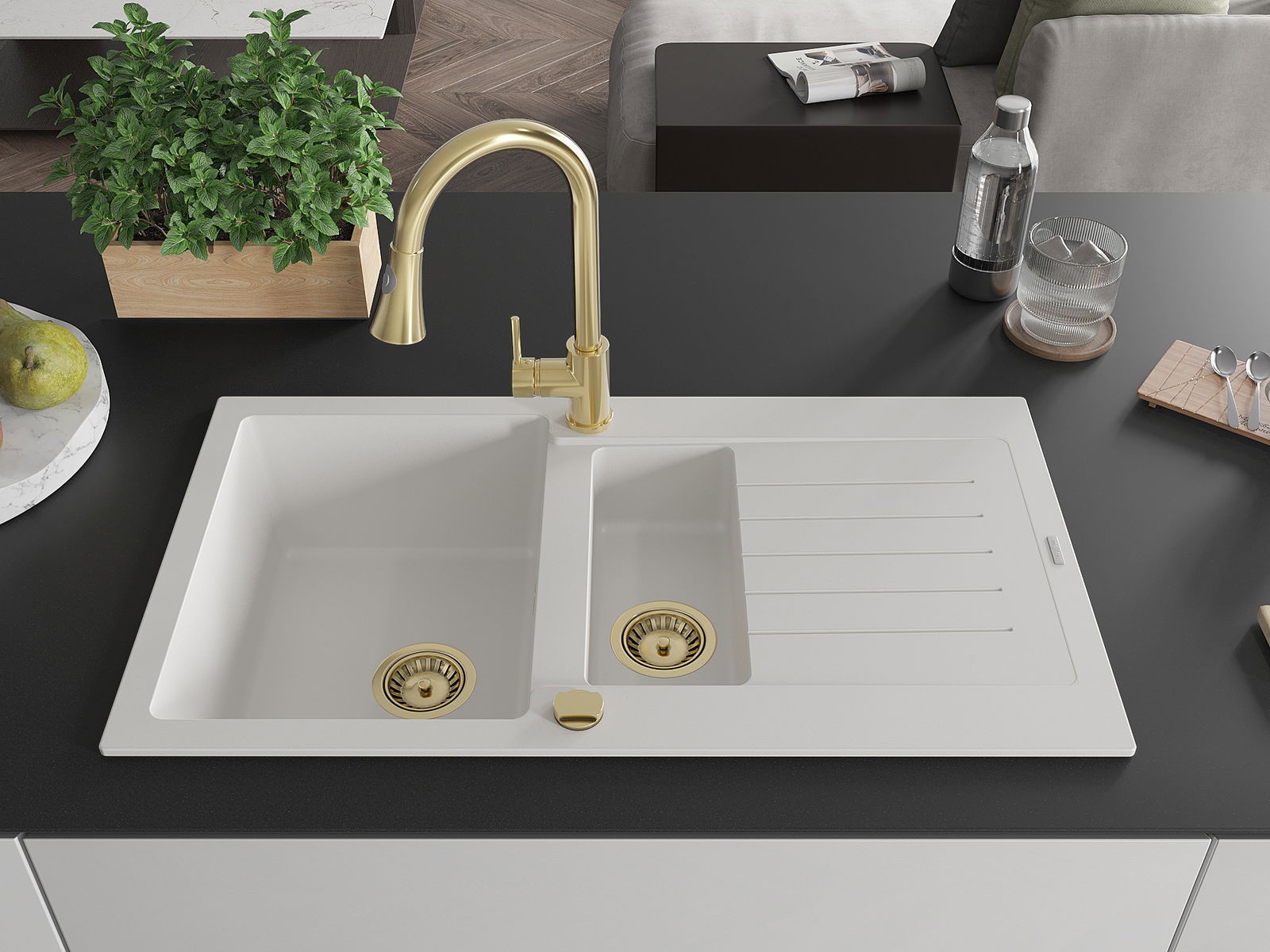 Mexen Matias chiuvetă din granit cu 1,5 compartimente, cu scurgător și baterie de bucătărie Elia, alb - 6502-20-670101-50