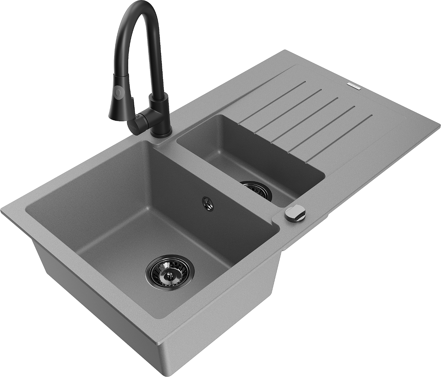Mexen Matias chiuvetă de granit cu 1,5 compartimente cu scurgător și robinet de bucătărie Elia, gri - 6502-71-670101-70-B