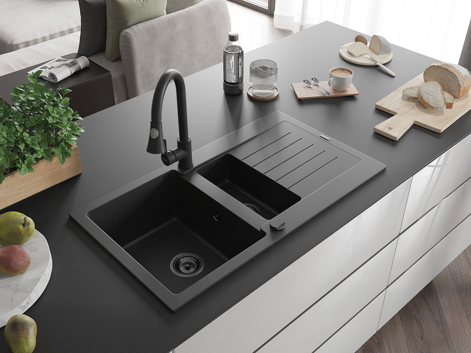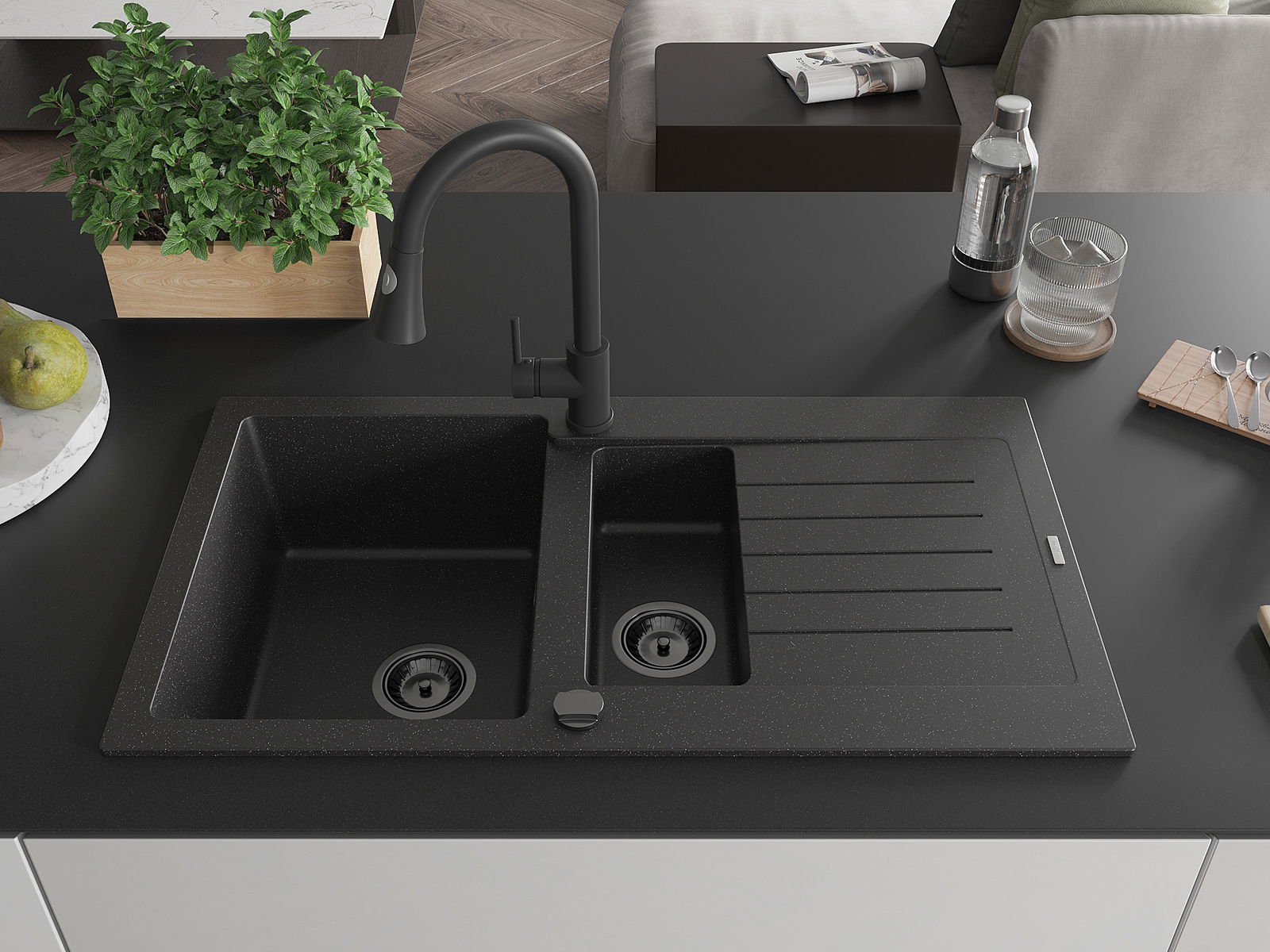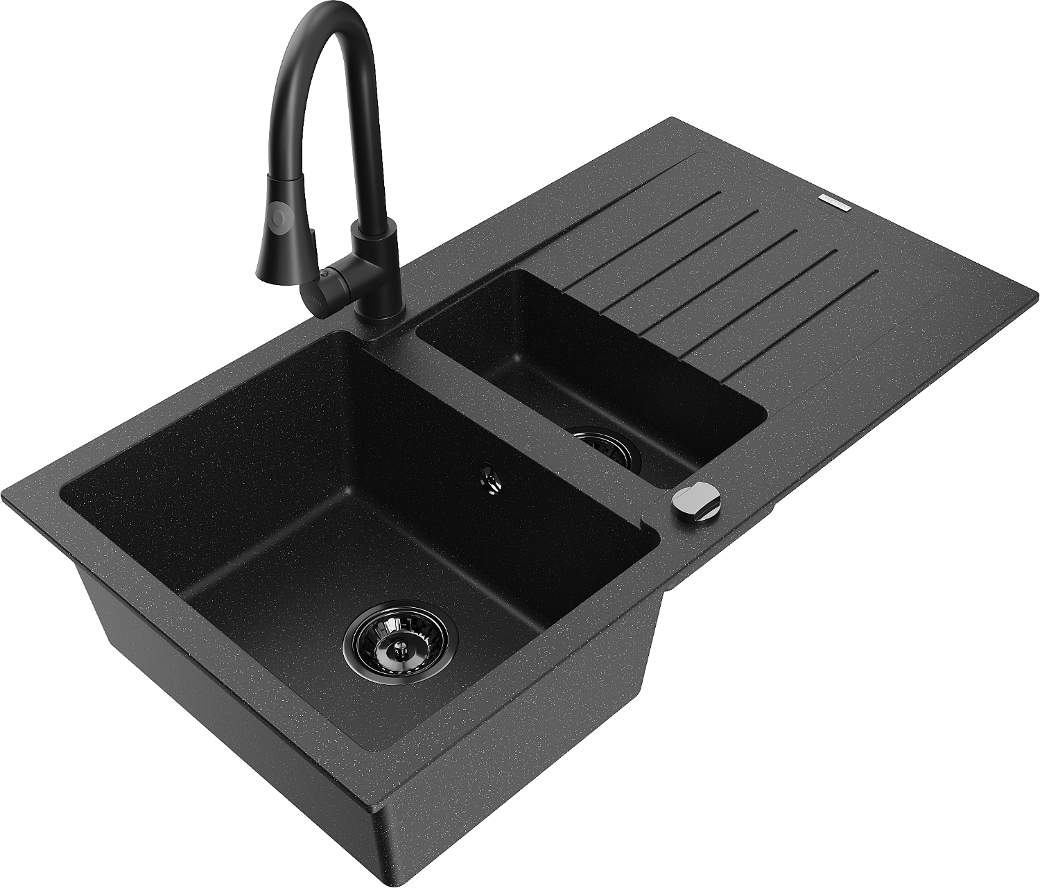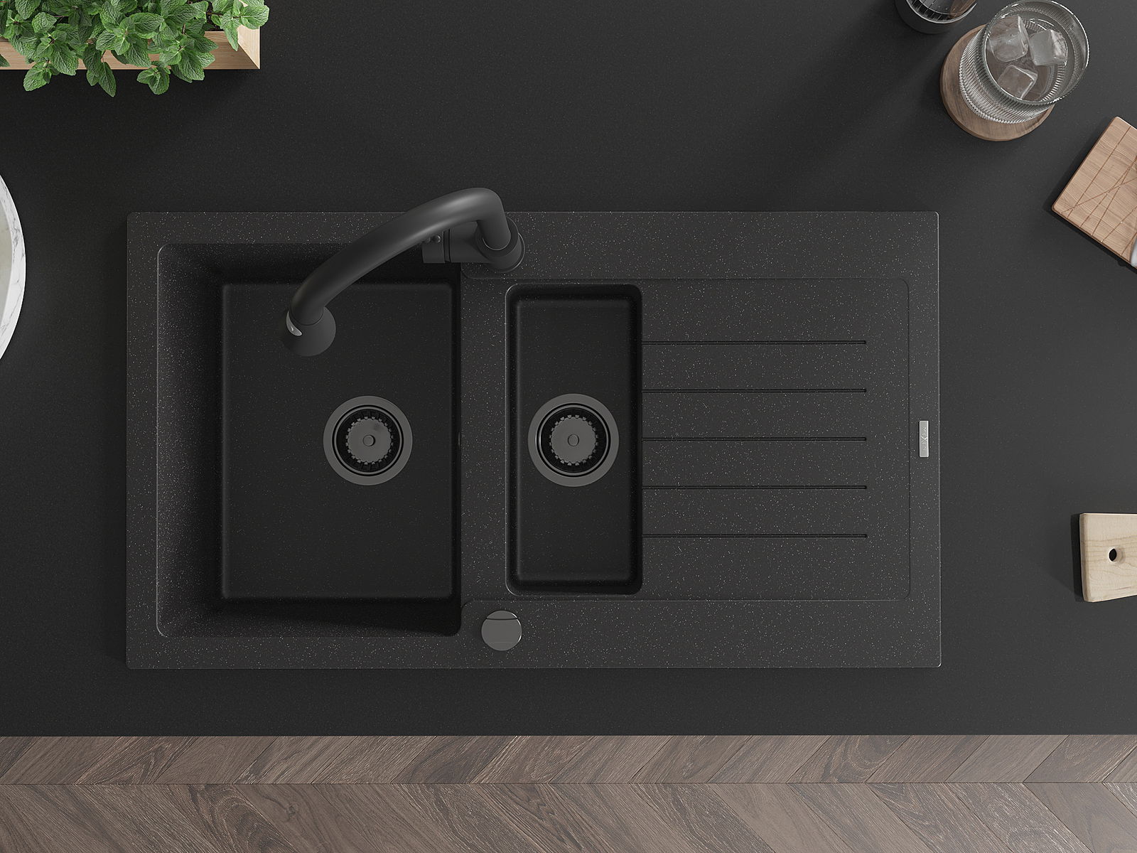 Mexen Matias chiuvetă de granit cu 1,5 camere și scurgător și baterie de bucătărie Elia, negru/argintiu
