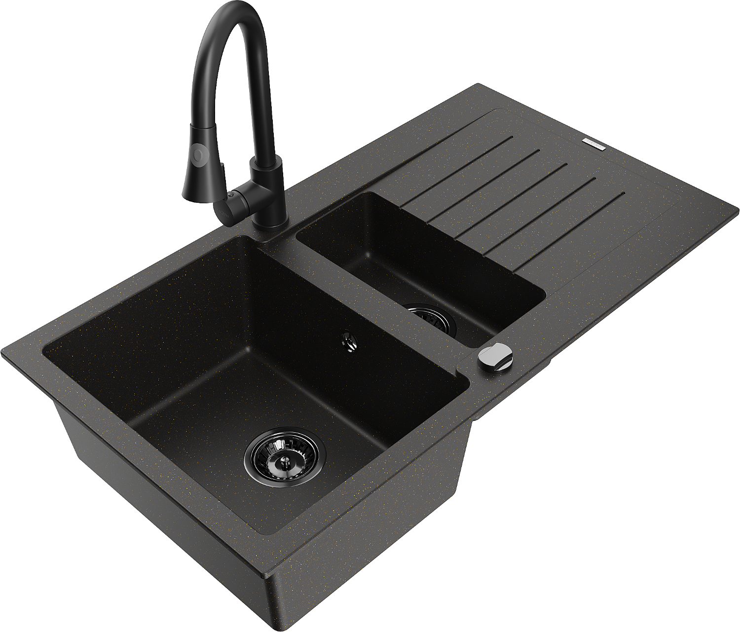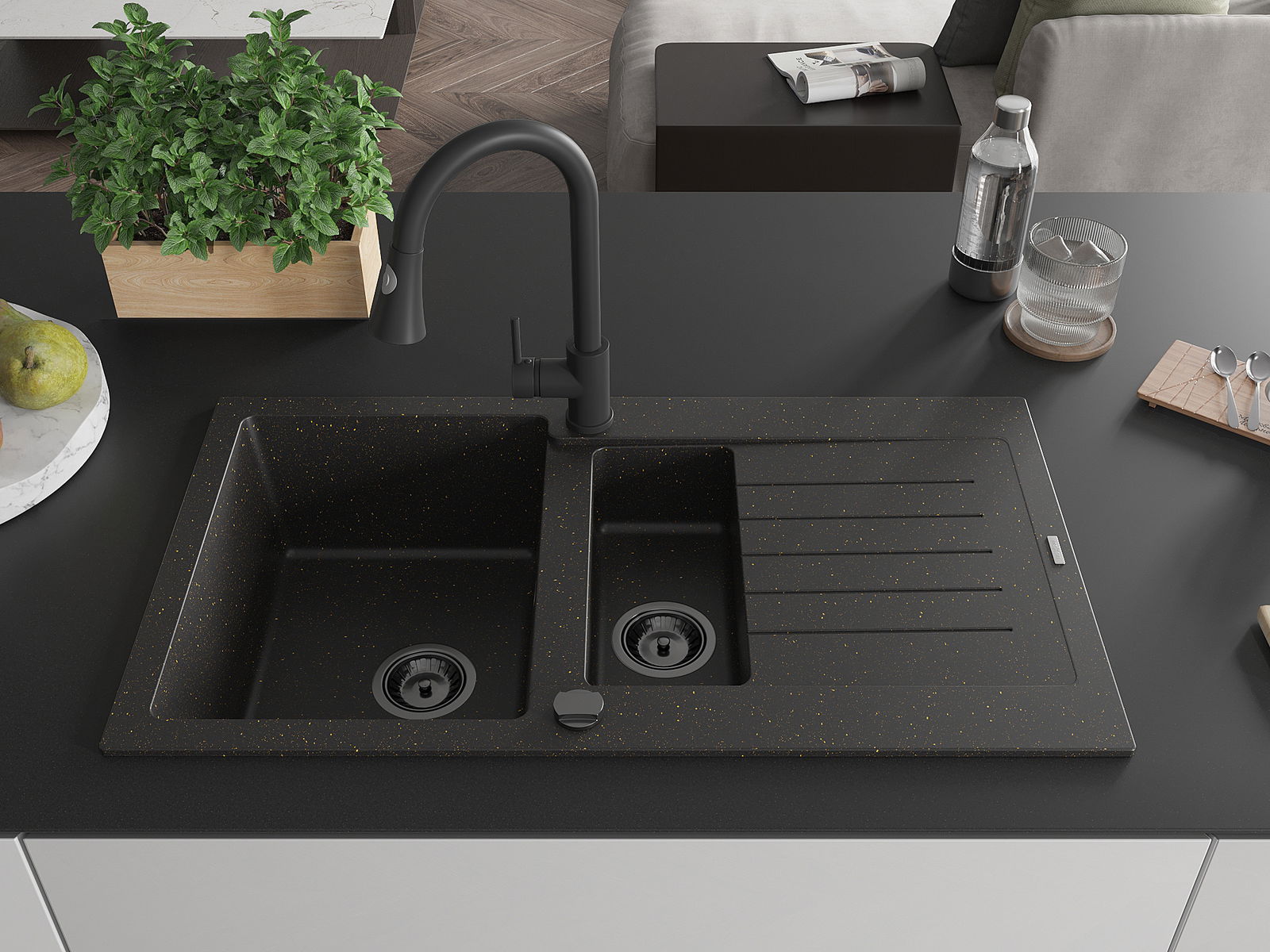 Mexen Matias chiuvetă din granit cu 1,5 cuve cu scurgător și baterie de bucătărie Elia, negru/auriu metalic