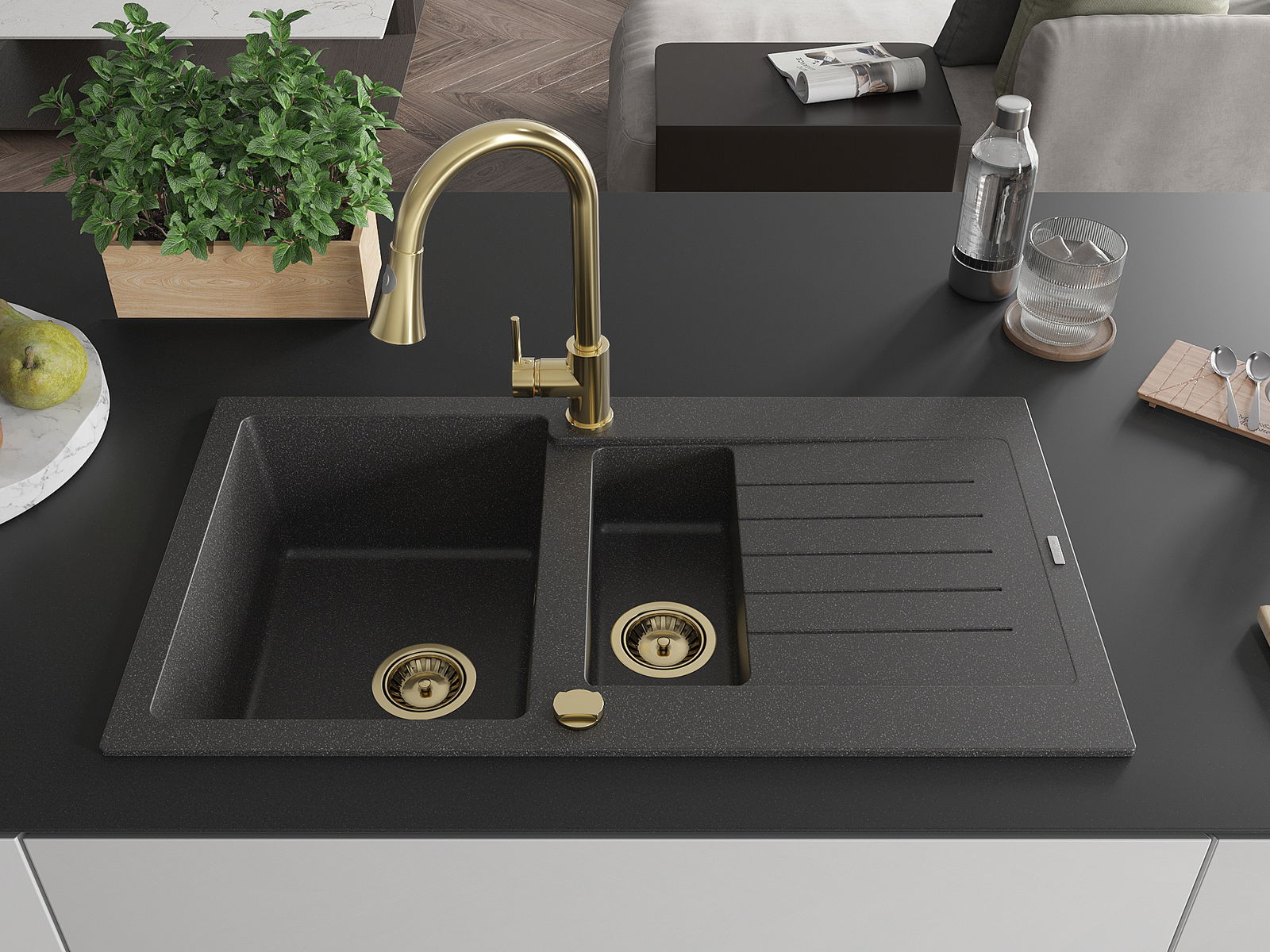 Mexen Matias chiuvetă de granit cu 1,5 cuve cu picurător și baterie de bucătărie Elia, negru stropit - 6502-76-670101-50