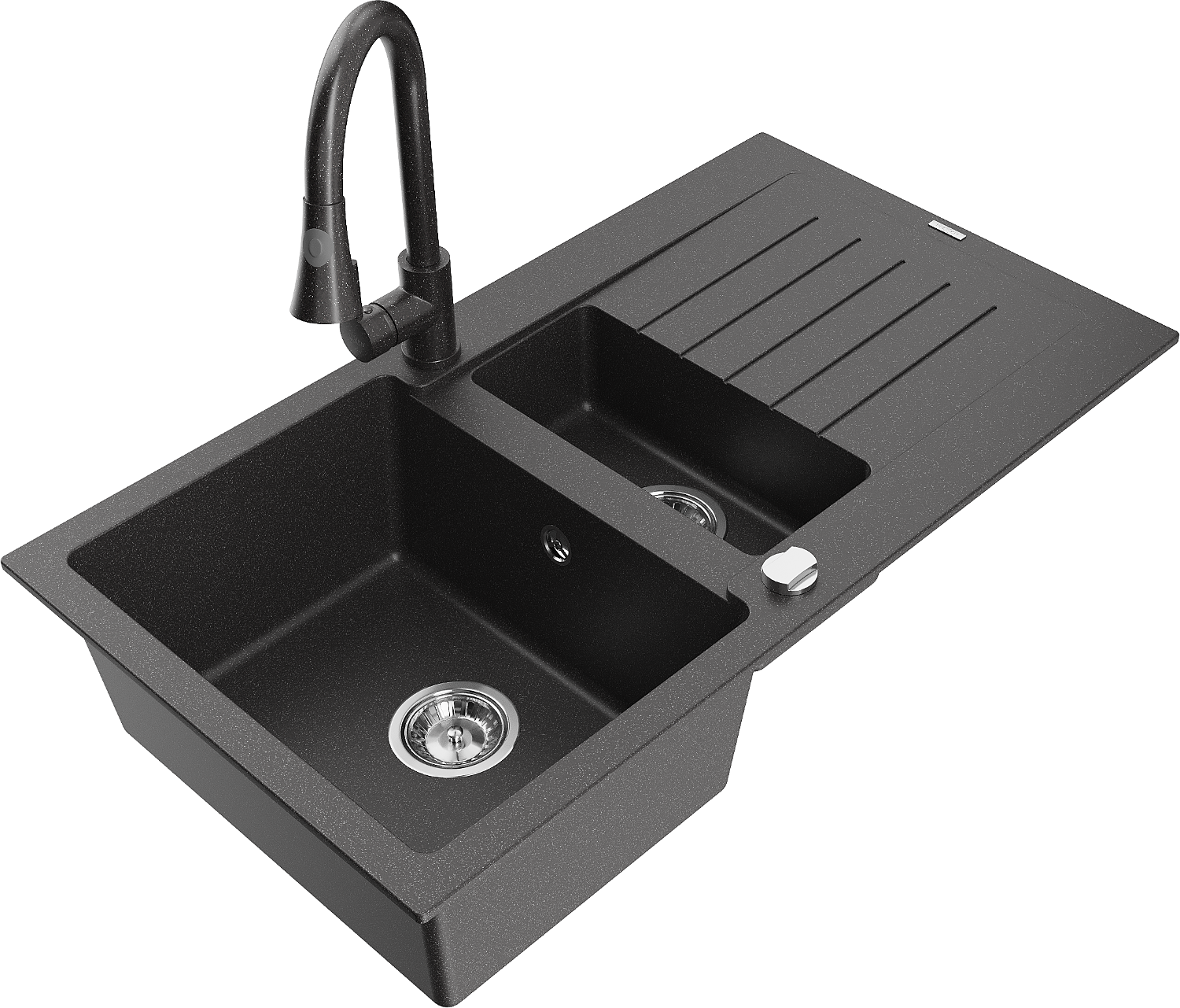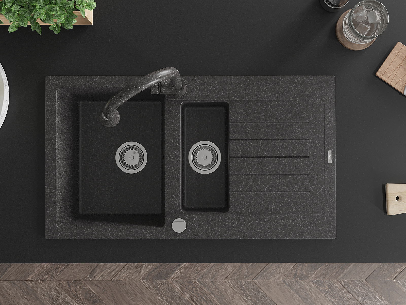 Mexen Matias chiuvetă de granit cu 1,5 compartimente și scurgător și baterie de bucătărie Elia, negru pătat - 6502-76-670101-76