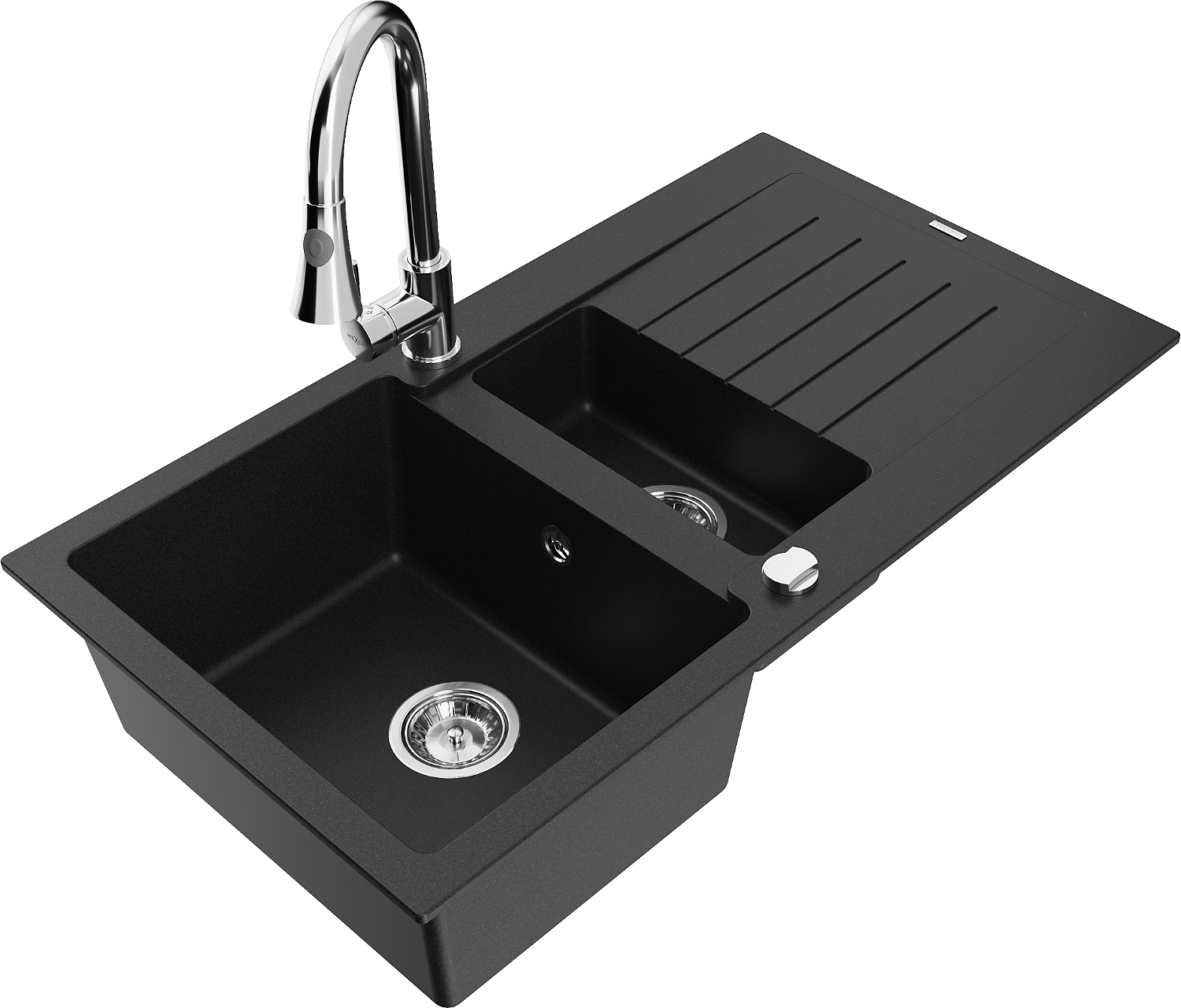 Mexen Matias chiuvetă de granit cu 1,5 compartimente cu scurgător și baterie bucătărie Elia, negru - 6502-77-670101-00