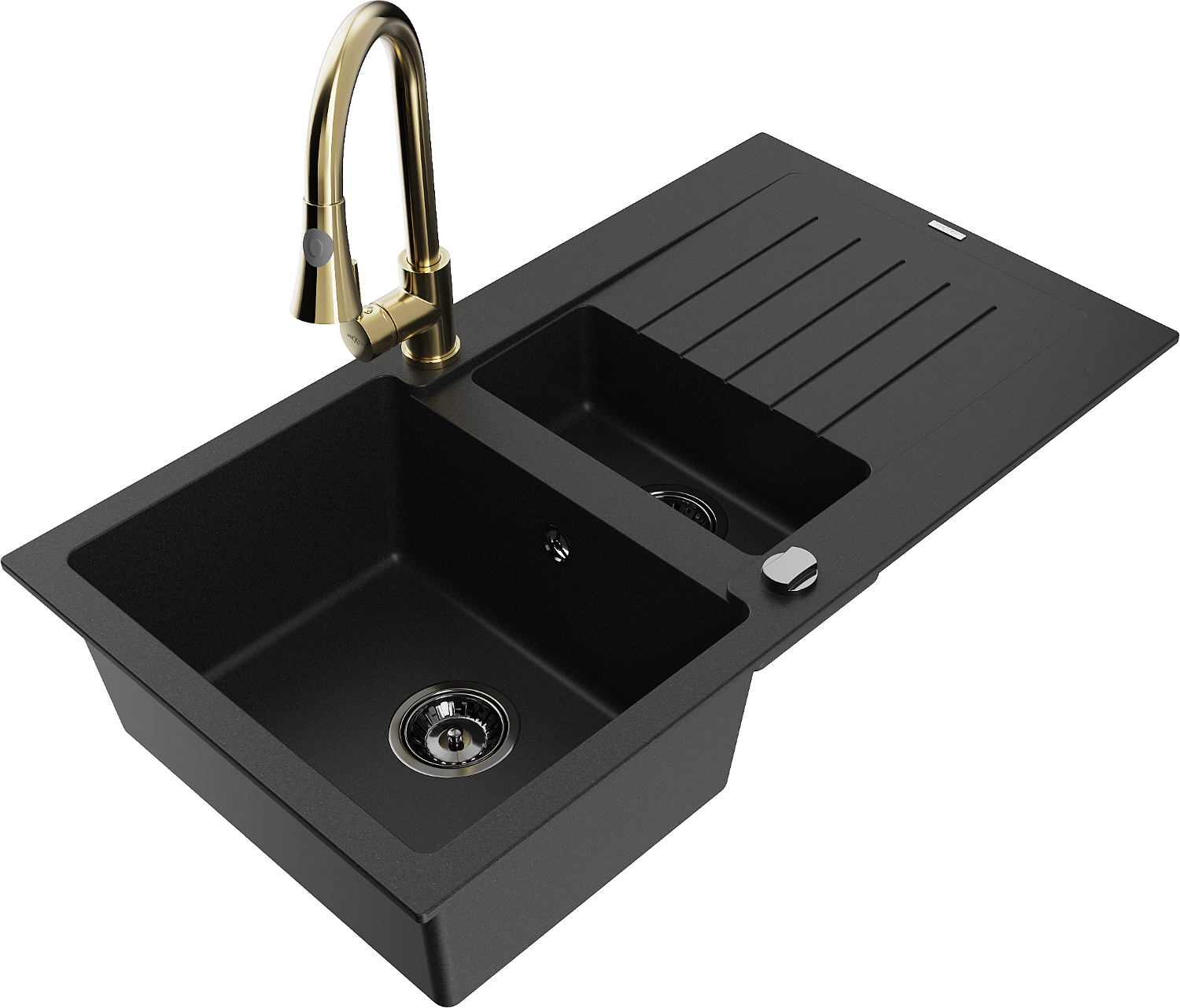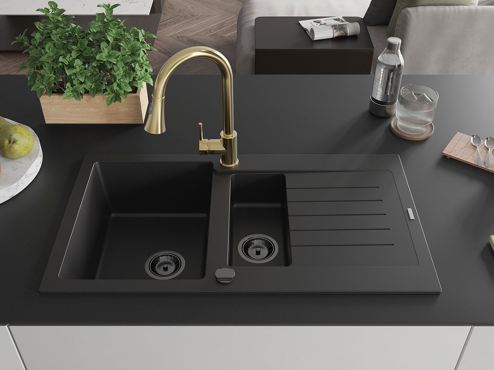 Mexen Matias chiuvetă de granit cu 1,5 cuve cu scurgător și baterie de bucătărie Elia, negru - 6502-77-670101-50-B