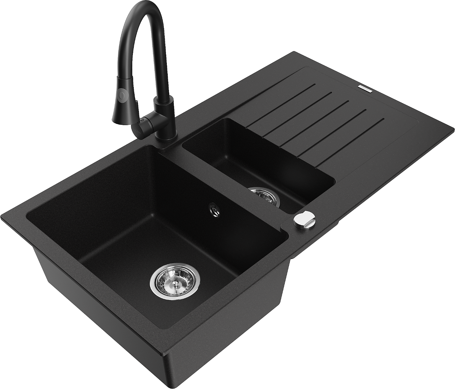 Mexen Matias chiuvetă din granit, 1,5 compartimente, cu scurgător și baterie de bucătărie Elia, negru - 6502-77-670101-70