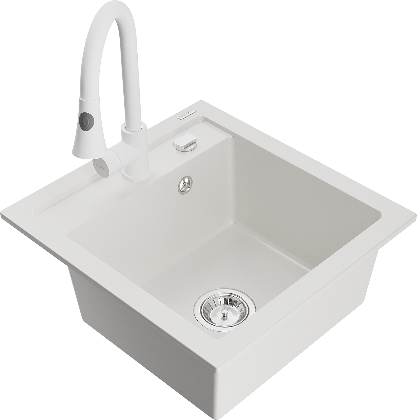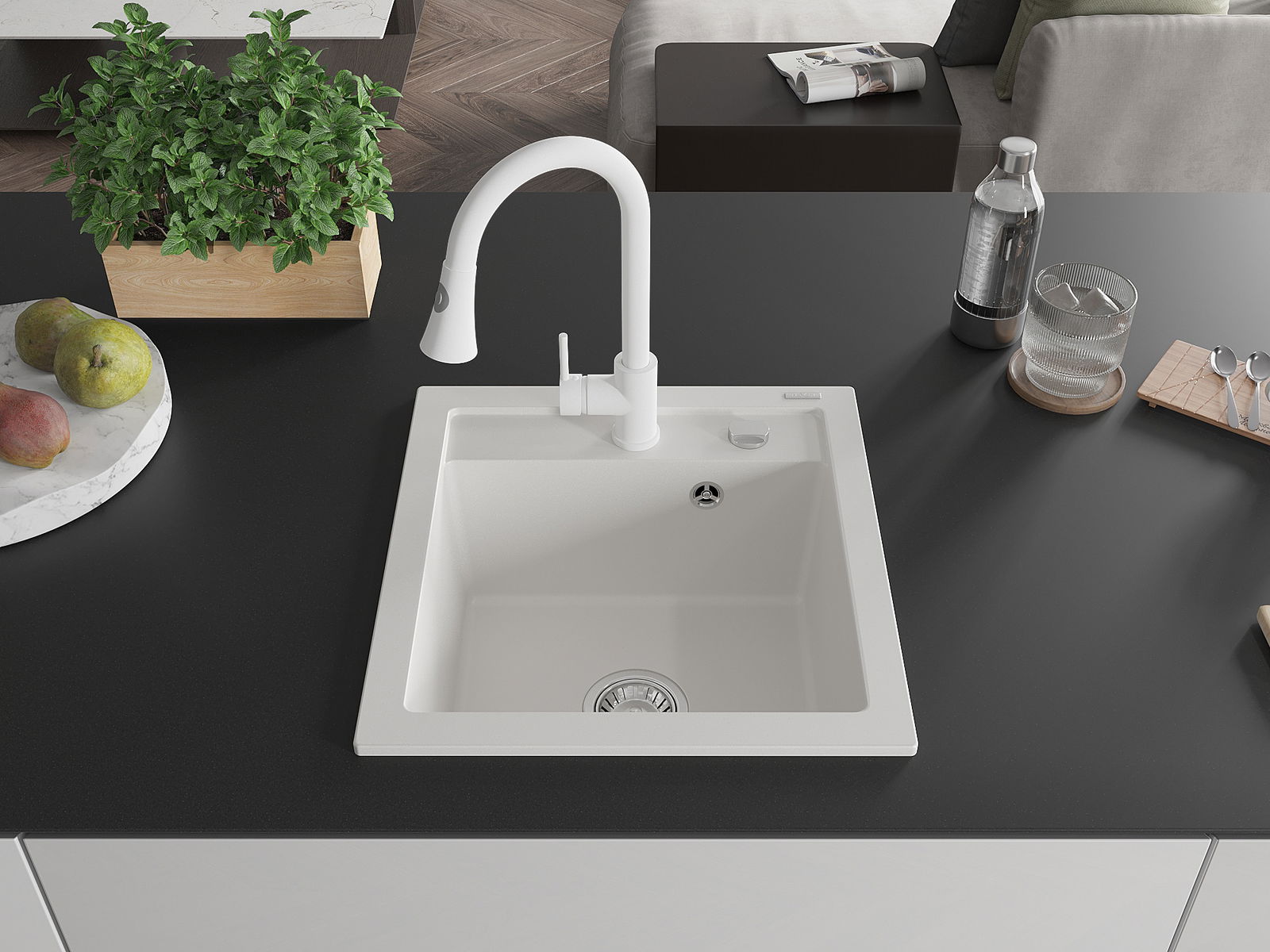 Mexen Vito chiuvetă de granit cu 1 cuvă și baterie de bucătărie Elia, alb - 6503-20-670101-20