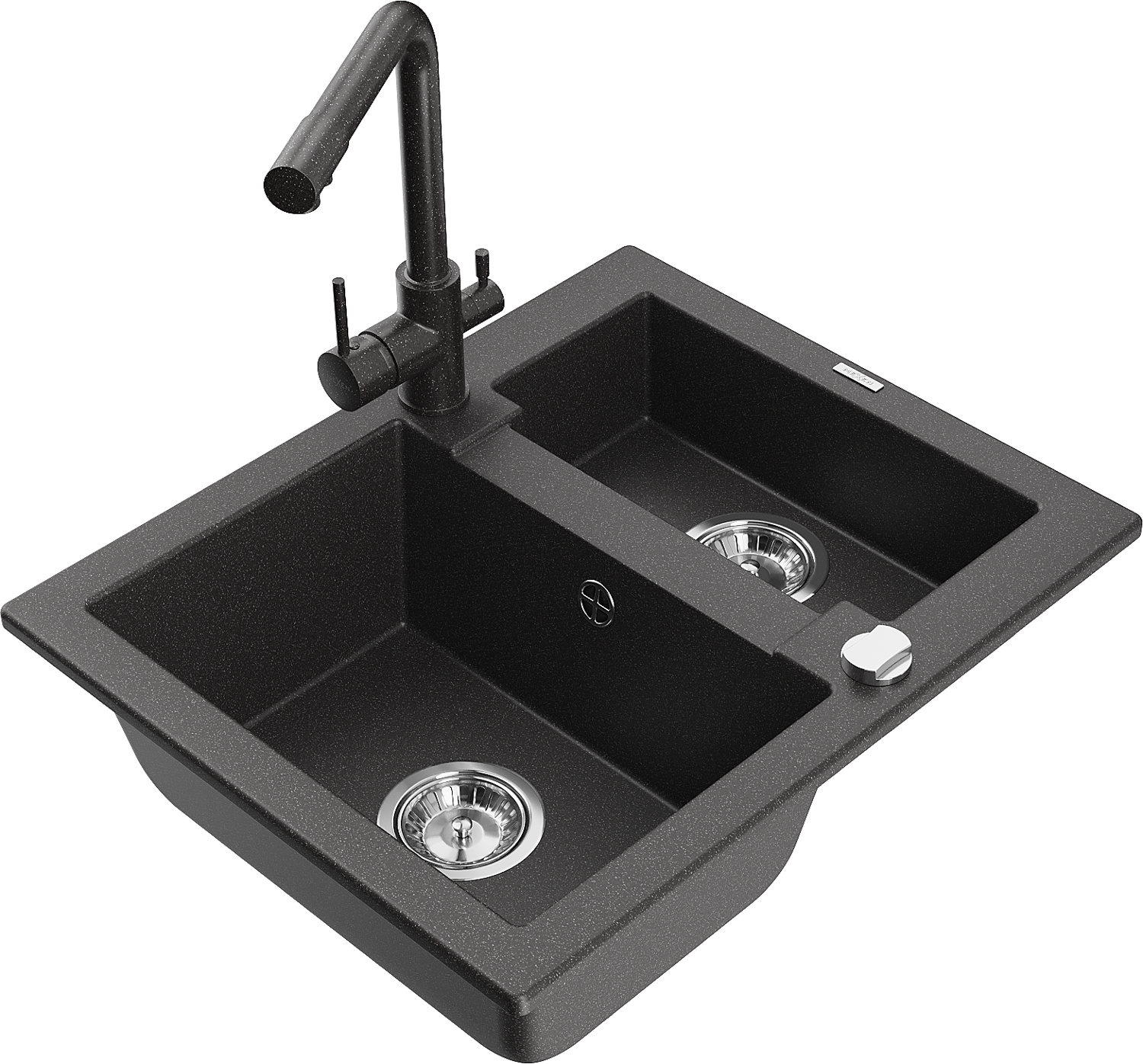 Mexen Carlos chiuvetă de granit cu 1,5 compartimente și baterie de bucătărie Duero, negru cu pete - 6518-76-671600-76