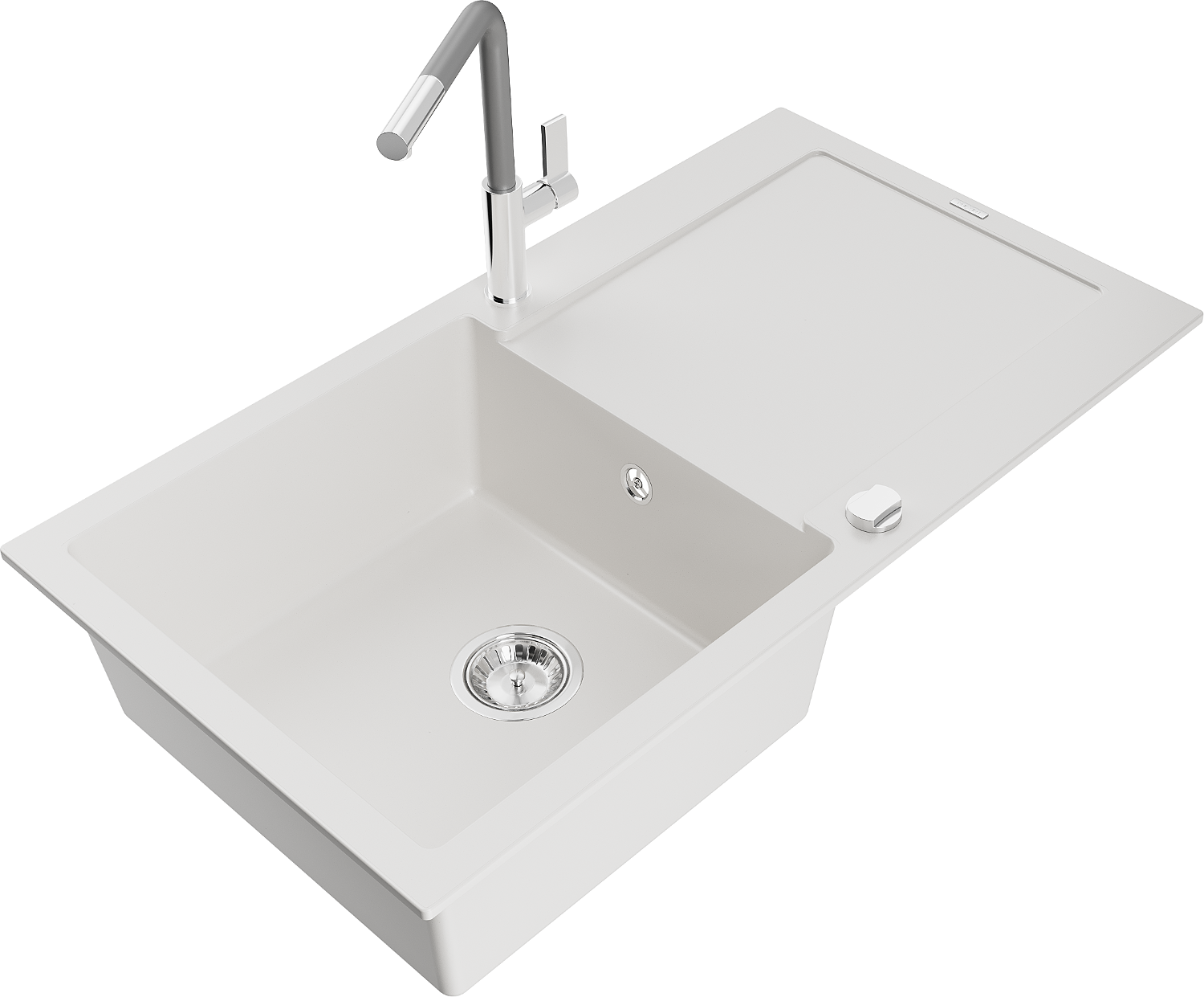 Mexen Leo chiuvetă din granit cu 1 compartiment și scurgător și baterie de bucătărie Flora, alb - 6501-20-670401-06