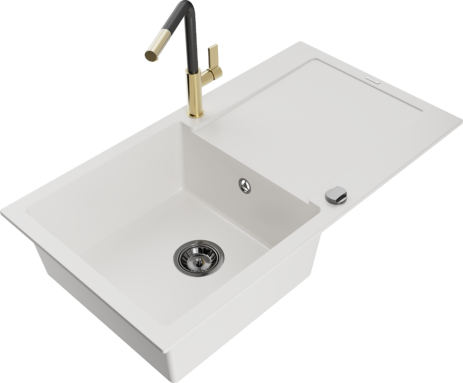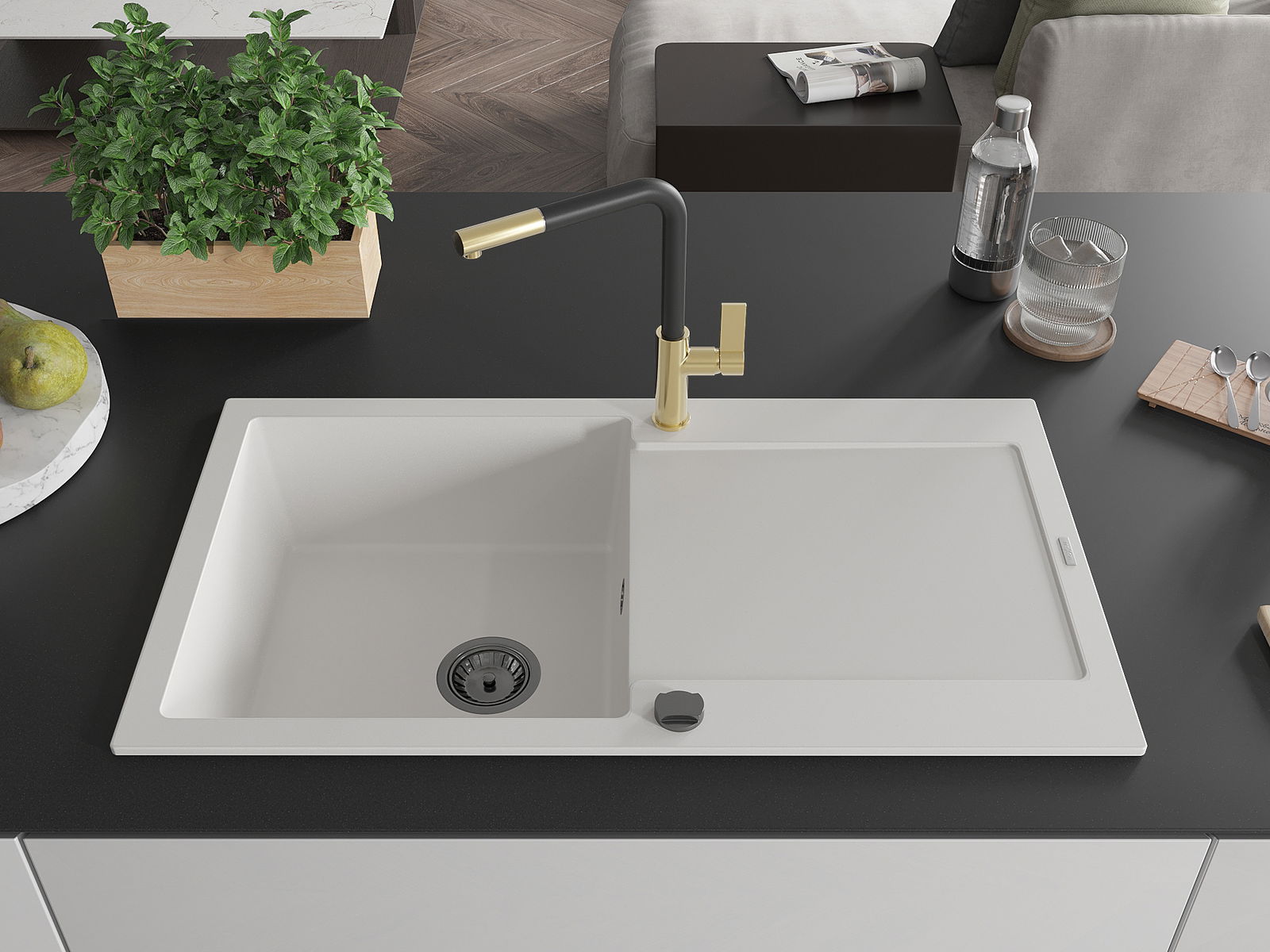 Mexen Leo chiuvetă de granit cu o singură cuvă și scurgător, cu baterie de bucătărie Flora, alb - 6501-20-670401-57-B