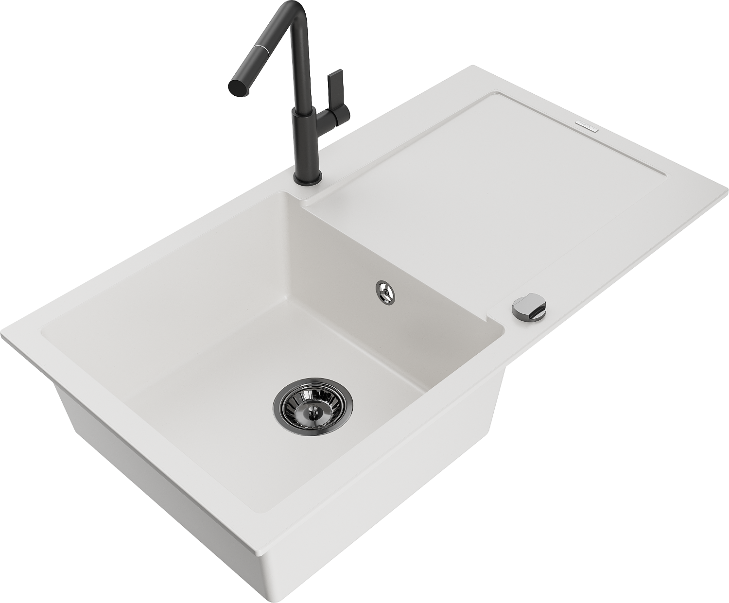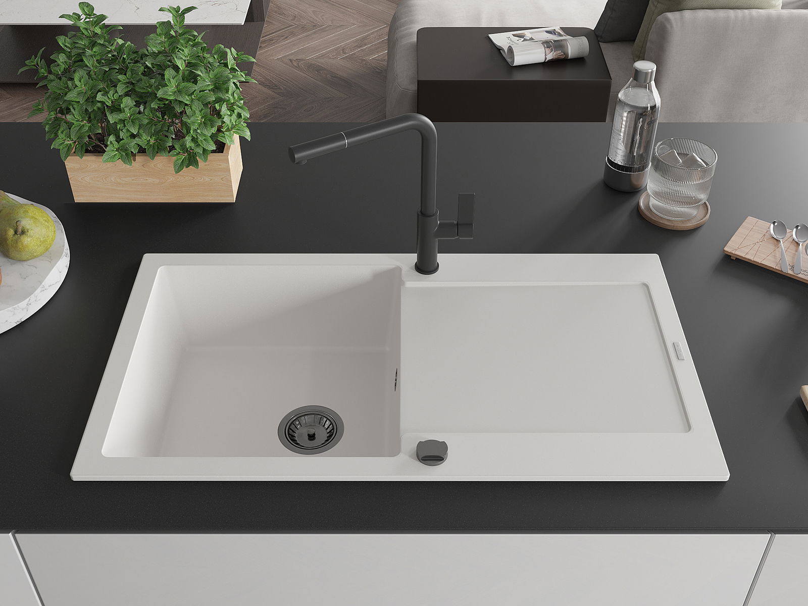 Mexen Leo chiuvetă de bucătărie din granit, cu o singură cuvă și picurător, și baterie Flora, albă - 6501-20-670401-70-B